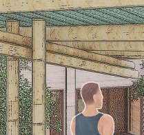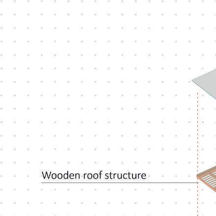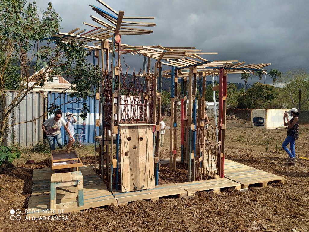 La structure secondaire se compose de poteaux poutres en bambous qui viennent soutenir le toit et les panneaux osb qui composent les autres murs.