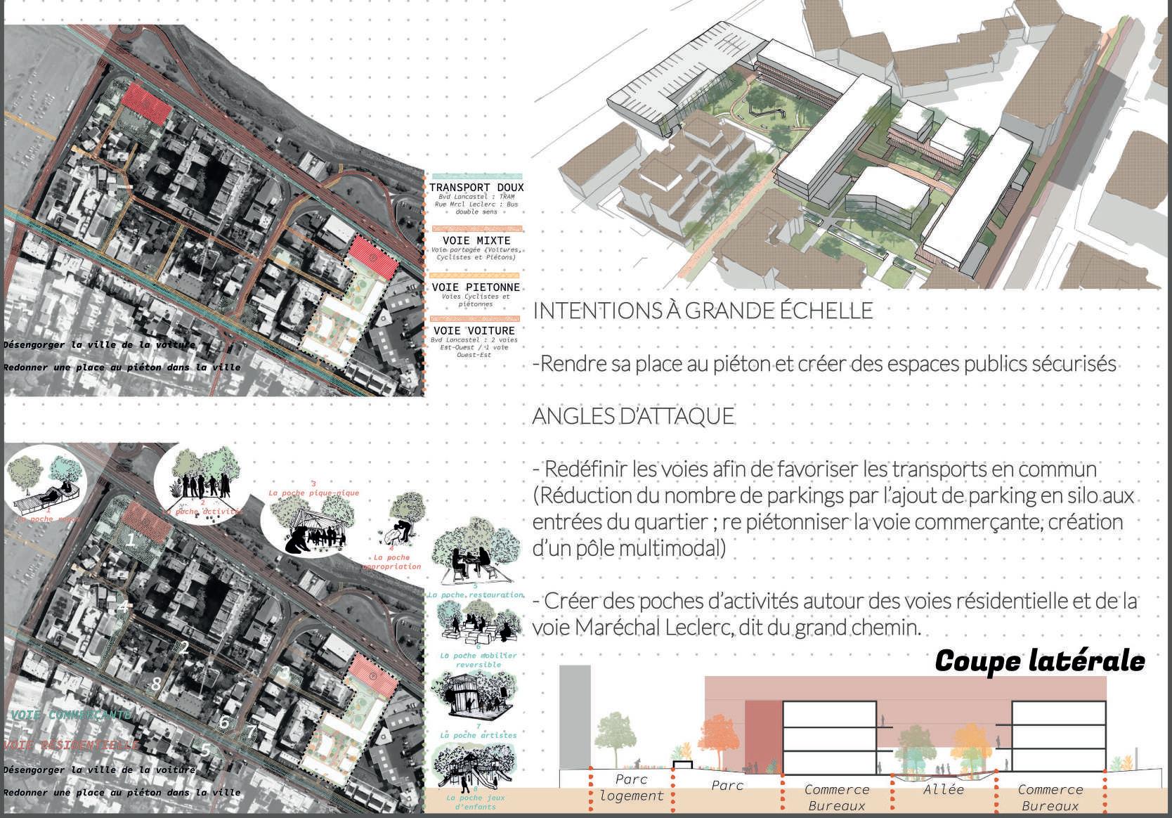 La parcelle se situe au carrefour du centre-ville historique, du littoral et du reste de la ville. Nous avons tenté de diversifier le plus possible les usages du site en venant implémenter un pôle pédagogique, un pôle culturel, un pôle artisanal, une place publique, un pôle multimodal, une greffe de la voie marchande existante, des bureaux et des logements.