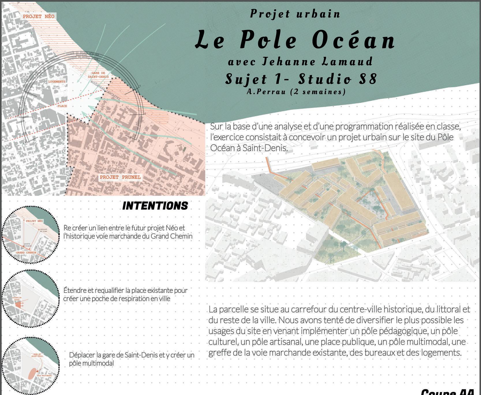 Sur la base d’une analyse et d’une programmation réalisée en classe, l’exercice consistait à concevoir un projet urbain sur le site du Pôle Océan à Saint-Denis.