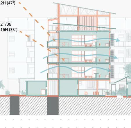 La façade Sud est protégée du soleil d’été par des brises soleils sur les coursives. Des persiennes orientables opaques permettent la ventilation dans les chambres et protègent du soleil.