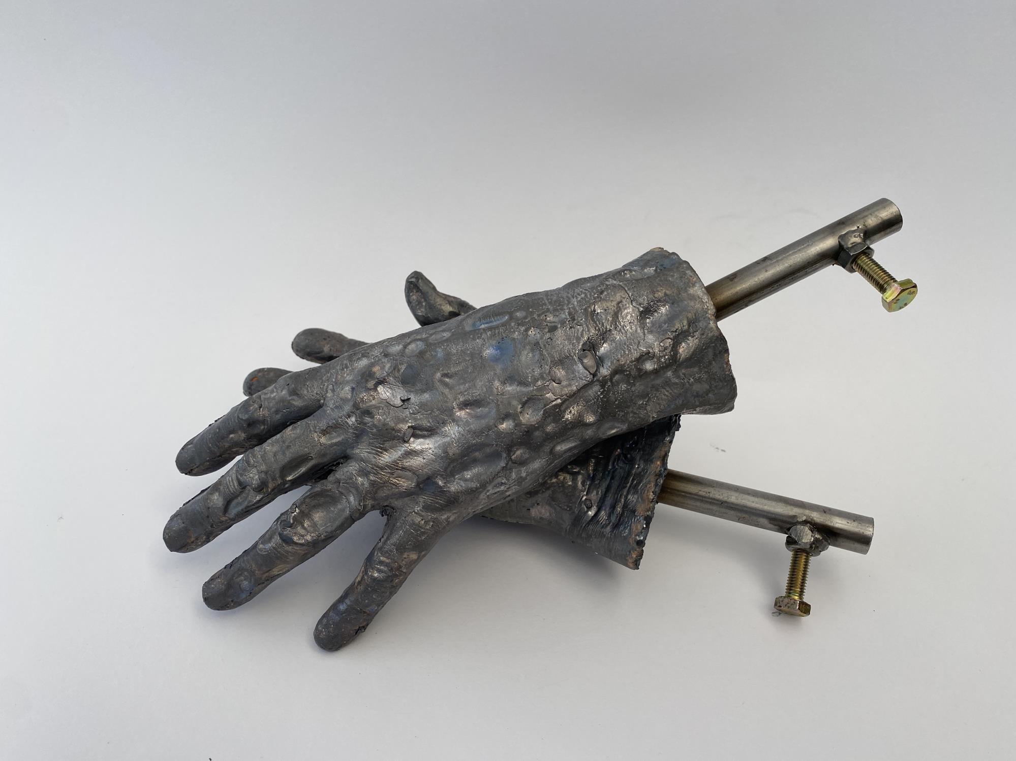 Contamination anxiety, 2021, the artist’s hands cast in lead, steel, nuts and bolts 1 of a series of 4 pairs