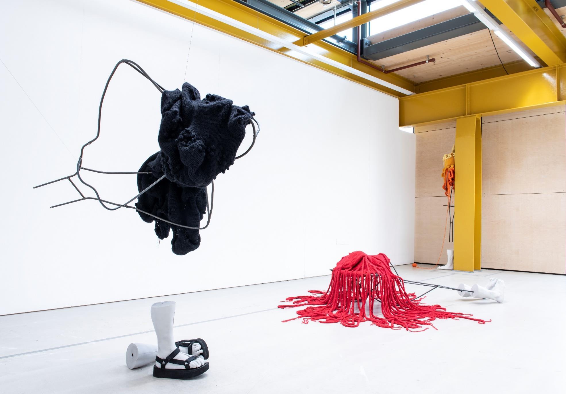 Parts of me, 2021, hand knitting, PVC, zips, stitch, steel, concrete, lead, the artist’s sandals, installed at The MA Degree Show, Bath Spa University, September Please click here