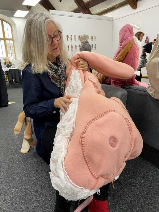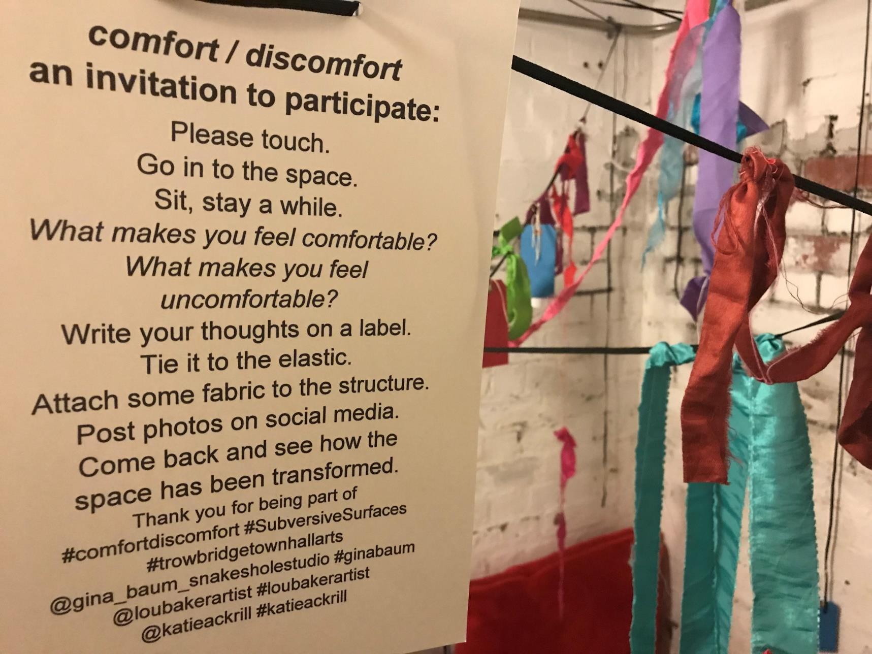 Visitors interacting with Transitional objects, 2022, at seam collective’s A Visible THREAD exhibition at ACEarts, Somerton, 26.11-24.12.22