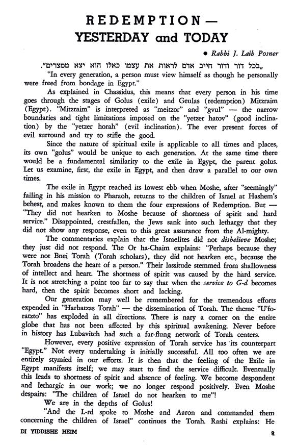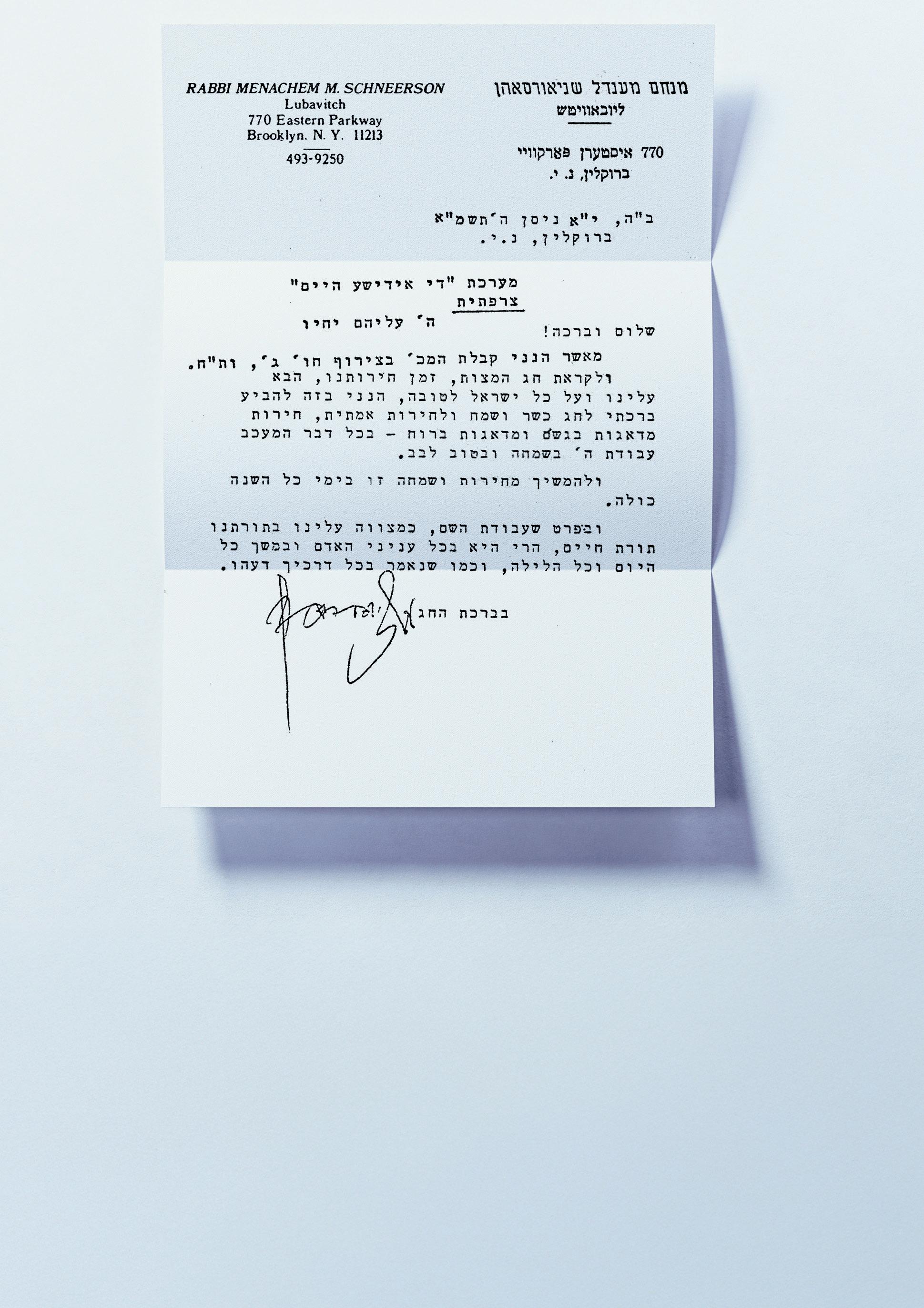 A l’approche de la fête des Matsoth, l’époque de notre libération, qu’elle vienne vers nous et vers tout lsraël pour le bien, je veux ici vous exprimer ma bénédiction pour une fête cachère et joyeuse et pour une véritable libération, libération des soucis matériels et spirituels, de toute chose qui peut entraver un service de D.ieu dans la joie et l’inspiration.