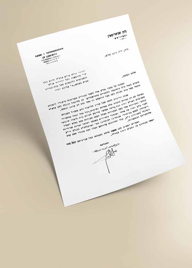 J’ai confiance que vous avez établi des moments d’étude de la Torah, à la fois dans ses enseignements esotériques et dans les enseignements de la ‘Hassidout ; en tout état de cause, faites-le à partir de maintenant. Il serait également approprié d’examiner vos tefilines ainsi que les mezouzot de votre foyer et de réserver quelques pièces pour la tsedakah, chaque matin de la semaine, avant la prière…