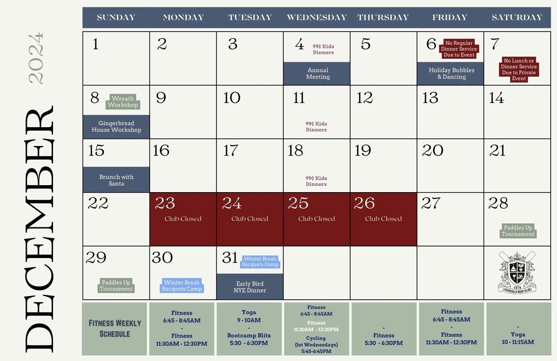 As the year comes to a close, I want to thank two members who are at the end of their terms and are rolling off of the Board Marty McClelland and Ginny Tyler Both have done an incredible job this year and have set things up so the next chairs of Racquets and Entertainment are ready to hit the ground running in the new year We already have a full calendar of events planned for 2025 and ask that you kindly RSVP so the Club can provide the best service possible