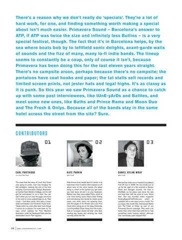 The week that this issue of Loud And Quiet was going to press, Carl was hanging his MA exhibition, marking the end of his time studying Communication Design Illustration at Central Saint Martins College, and he still got his commission to us in time. You can see it when you turn over the page, and more of his work at www.carlpartridge.co.uk. Take a look – Carl likes candy. He’s also a cream soda connoisseur and irreverent music lover. “Ideas within my work often stem from things I cannot do or places I’ve never been to,” he says, which explains his Time Machine illustration, while his Skatepark Kids look like dishevelled South Park regulars.