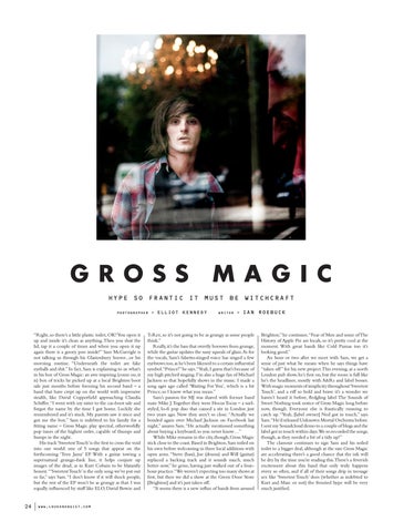 T-Rex, so it’s not going to be as grungy as some people think.” Really, it’s the bass that overtly borrows from grunge, while the guitar updates the sassy squeals of glam. As for the vocals, Sam’s falsetto-tinged voice has singed a few eyebrows too, as he’s been likened to a certain influential symbol.“Prince!” he says.“Yeah, I guess that’s because of my high pitched singing. I’m also a huge fan of Michael Jackson so that hopefully shows in the music. I made a song ages ago called ‘Waiting For You’, which is a bit Prince, so I know what you mean.” Sam’s passion for MJ was shared with former band mate Mike J. Together they were Hocus Tocus – a surfstyled, lo-fi pop duo that caused a stir in London just two years ago. Now they aren’t so close. “Actually we bonded again over Michael Jackson on Facebook last night,” assures Sam. “He actually mentioned something about buying a keyboard, so you never know…” While Mike remains in the city, though, Gross Magic stick close to the coast. Based in Brighton, Sam toiled on his own before welcoming in three local additions with open arms. “Steve (bass), Joe (drums) and Will (guitar) replaced a backing track and it sounds much, much better now,” he grins, having just walked out of a fourhour practice.“We weren’t expecting too many shows at first, but then we did a show at the Green Door Store [Brighton] and it’s just taken off. “It seems there is a new influx of bands from around