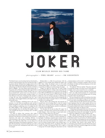 instrumentation on the record – everything you hear is synthetic, which is amazing to imagine when you hear the flutter of violins and hammering piano in the intro to ‘On My Mind’. “It’s software,” McLean clarifies.“You press a key and it sounds like strings, so you don’t need a violin player to actually come in, you can just do it on a computer. “When you think of grime, dubstep, bass and R&B – that’s not really band-orientated, it’s computerised music and when I first started making music at a young age, that’s what I was listening to.” He even channels his vocals as if synth lines, but when we ask if he ever felt tempted to sing over his own tracks, we’re met with a resounding and drawn-out “naaaah”. As Joker, McLean has also claimed in the past to have taken inspiration from the colour purple, and you can easily find old press shots of him decked head-to-toe in the opulent shade, but he hates to mention it now, along with most other topics we discuss, in fact. “I think that whole purple shit went a bit too far,” he says irritably.“It’s just a bit gay and people are always like, ‘Oh purple this, I wanna see some purple’. So now I’m trying to go a different way and try different shit.” He’s already started writing for the next album, despite ‘The Vision’ having only hit shop shelves at the end of last month.“I’m one track in,” he admits modestly. “I don’t even know if it’s going to be my second album.” But no matter where this track leads, it’s clear that Joker is one Brizzler who doesn’t mess around. Not in conversation and certainly not in the slick electro-grime that makes ‘The Vision’ sound far bigger than its modest keyboard’n’mouse origins.