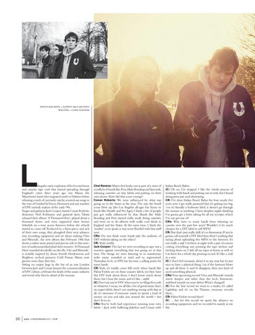 Italian Beach Babes. JC: Oh no, I’ve stopped. I like the whole process of working with bands and putting out records, but I found doing press just soul-destroying. CR: I’ve done Italian Beach Babes for four, nearly five years now. I get really paranoid that it’s getting too big, ‘cos it’s literally a bedroom label, it doesn’t go through the taxman or anything. I have sleepless nights thinking I’m gonna get a letter asking for all my receipts, which I’ve not got any of! CRa: Why have so many bands been releasing on cassette over the past few years? Wouldn’t it be much cheaper for a DIY label to sell MP3s? CR: But that’s just really dull, it’s so throwaway. If you’re gonna call yourself a DIY label then there’s nothing that taxing about uploading five MP3s to the Internet. It’s not really a craft. I sit there at night with a pair of scissors cutting everything out, printing the tape stickers and sticking them on. I dub all my tapes at home as well, so I sit there for a whole day pressing record. It’s like a craft in a way. JC: I don’t feel romantic about it in any way, but it’s just nice to have a physical thing, ‘cos if the Internet blows up and all those 1s and 0s disappear, then you kind of need something physical. CRa: Your upcoming record ‘Ores and Minerals’ sounds much sharper and tidier than the lo-fi, Pavementindebted sounds on your debut.What’s changed? JC: For the first record we went to a studio, it’s called Lightship and it’s on the Thames, everyone records there... CR: Palma Violets record there! JC: ... but for this record we spent the advance on recording equipment, and we recorded it mainly at my flat.