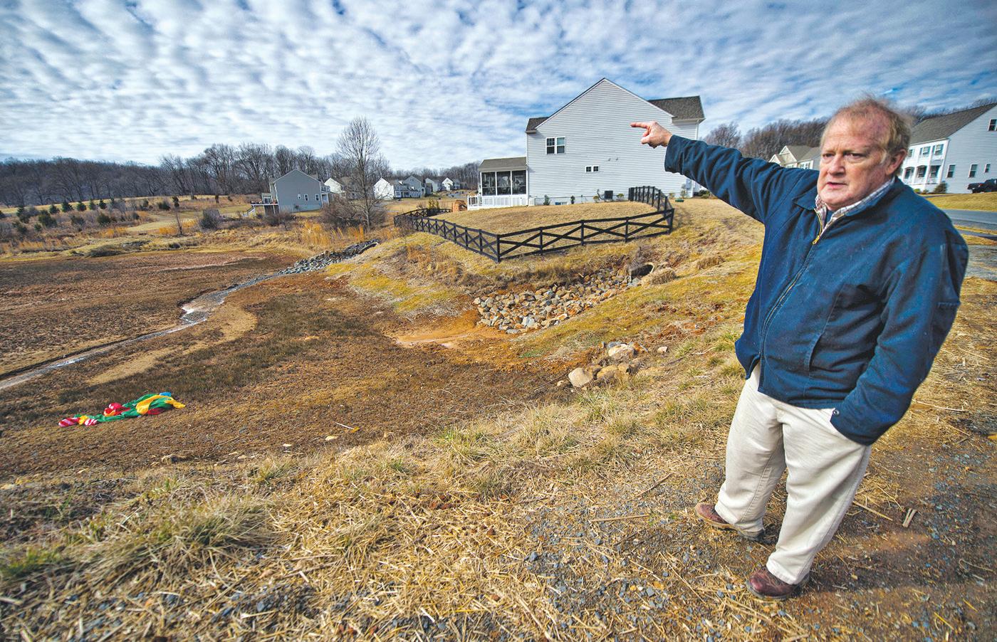 Douglas Graham/Loudoun Now Selma Estates resident George Biller points out what he says are flaws in the design of a retention pond that is now filled with silt and mud runoff from storm water in this 2018 photo.
