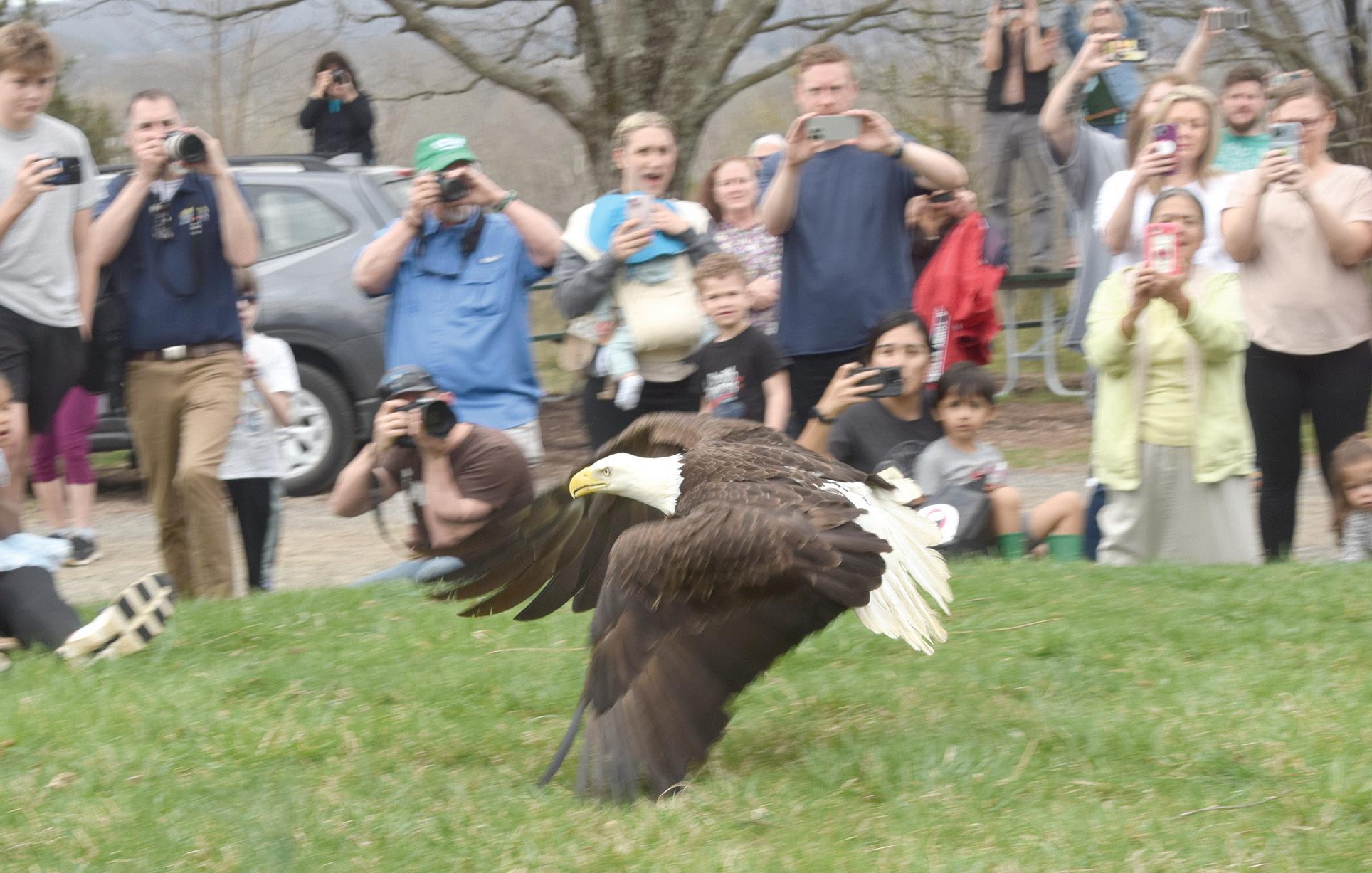 The eagle was released from a transport carrier in the rear yard of the Education Center at the county’s Banshee Reeks Nature Preserve. In front of a crowd of families gathered to watch the event, the eagle hopped to the edge of the carrier, swooped through the yard, and flew off into the distance, disappearing into the forest. n