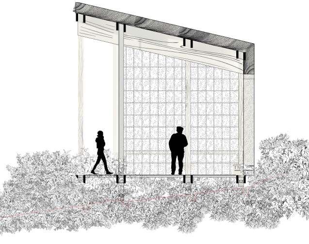 Sa matérialité pensée pour affronter les intempéries, ce signal urbain s’inscrit comme un refuge protecteur contre le vent et les conditions météorologiques adverses. De plus, il joue le rôle d'un point d'accueil, un lien entre architecture et