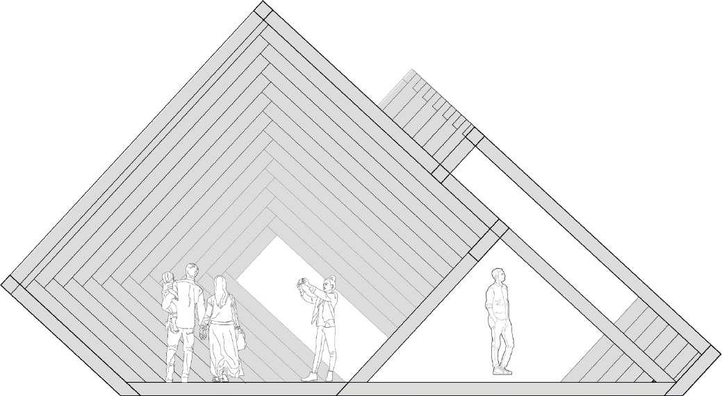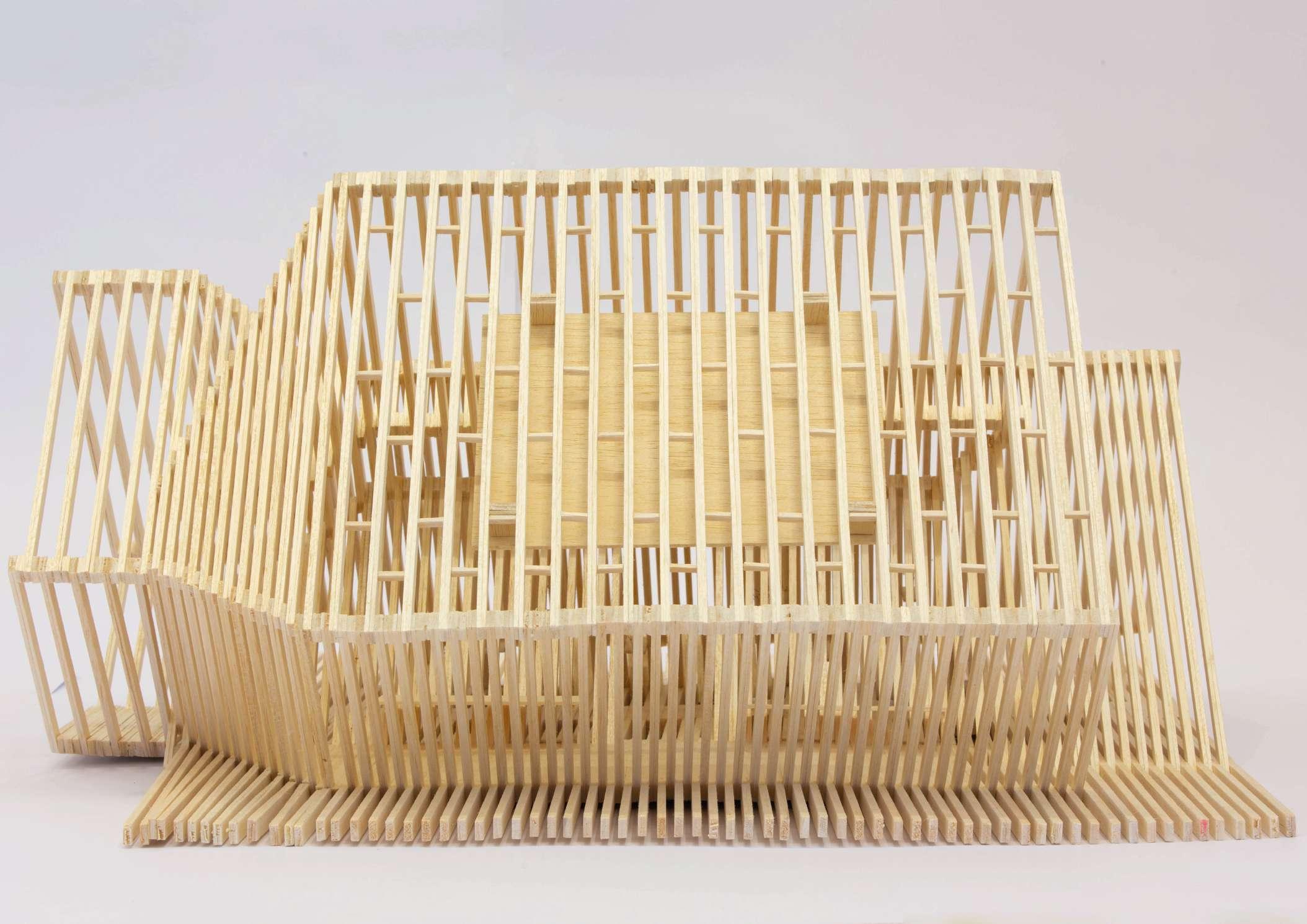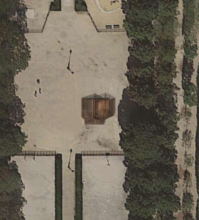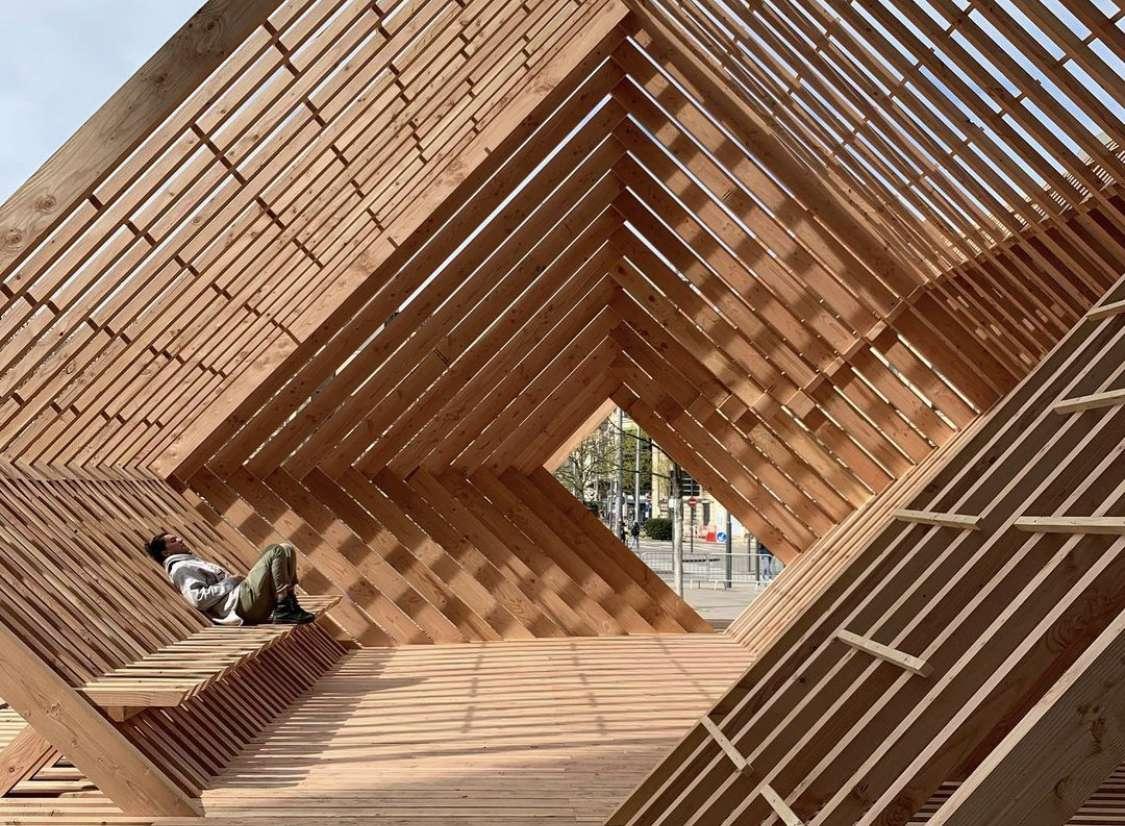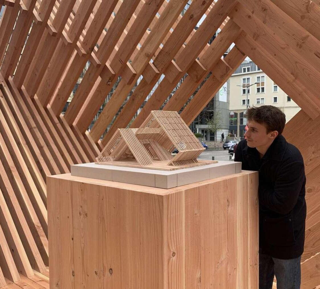 C’est au départ une commande, conçu pour faire la démonstration du bois en tant que matériau de construction à l’occasion du Forum Bois. Ses composants proviennent de découpes de scieries française partenaire de l’évènement. Il a servi de lieu de communication, d'échange et de passage.