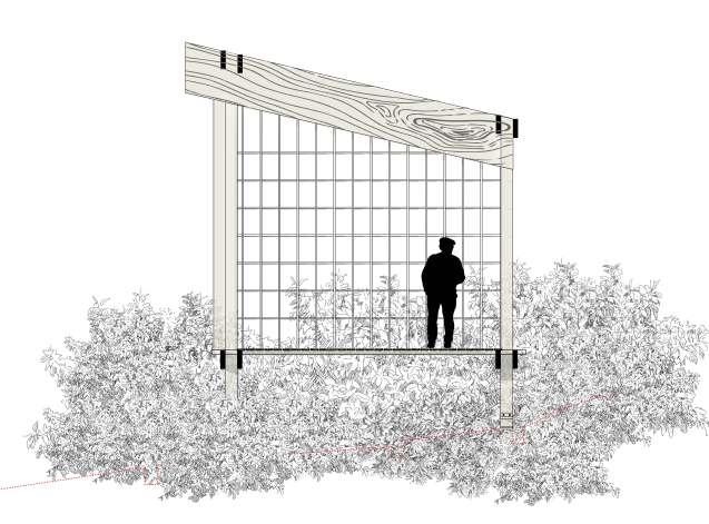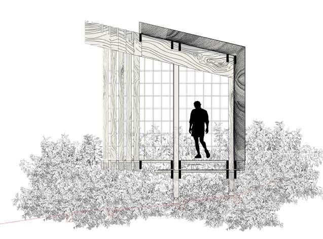 La structure du pavillon est faite en douglas, avec des éléments de même section (70x210 mm²).