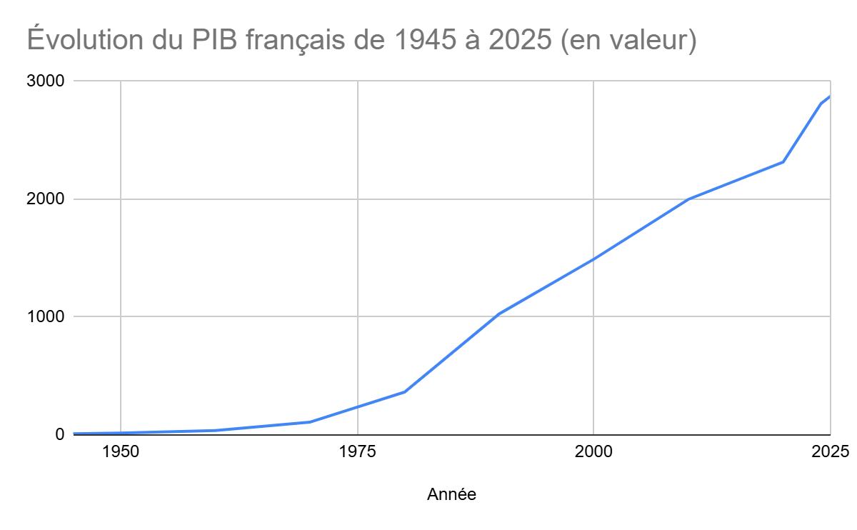 Entre les années 1945 et 1960, la progression du PIB français est très forte en pourcentage. Ensuite, il y a le choc qui impacte la croissance par la suite.