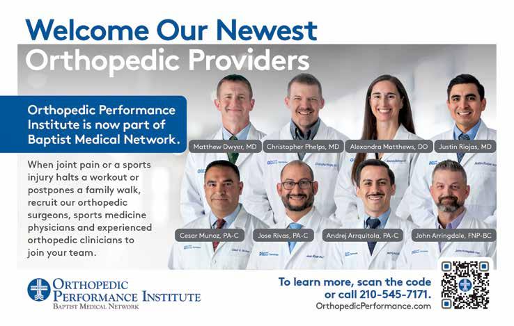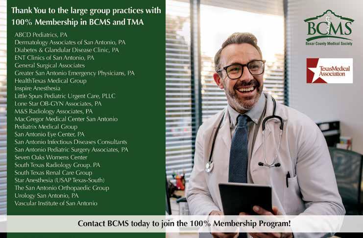 SAN ANTONIO MEDICINE is published by SmithPrint, Inc. (Publisher) on behalf of the Bexar County Medical Society (BCMS). Reproduction in any manner in whole or part is prohibited without the express written consent of Bexar County Medical Society. Material contained herein does not necessarily reflect the opinion of BCMS, its members, or its staff. SAN ANTONIO MEDICINE the Publisher and BCMS reserves the right to edit all material for clarity and space and assumes no responsibility for accuracy, errors or omissions. San Antonio Medicine does not knowingly accept false or misleading advertisements or editorial nor does the Publisher or BCMS assume responsibility should such advertising or editorial appear. Articles and photos are welcome and may be submitted to our office to be used subject to the discretion and review of the Publisher and BCMS. All real estate advertising is subject to the Federal Fair Housing Act of 1968, which makes it illegal to advertise “any preference limitation or discrimination based on race, color, religion, sex, handicap, familial status or national origin, or an intention to make such preference limitation or discrimination.