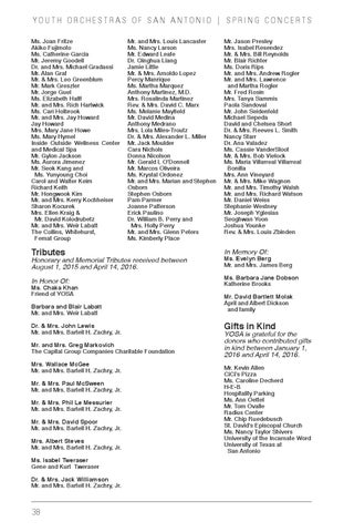 Honorary and Memorial Tributes received between August 1, 2015 and April 14, 2016. Ms. Chaka Khan Friend of YOSA Barbara and Blair Labatt Mr. and Mrs. Weir Labatt Dr. & Mrs. John Lewis Mr. and Mrs. Bartell H. Zachry, Jr. Mr. and Mrs. Greg Markovich The Capital Group Companies Charitable Foundation Mrs. Wallace McGee Mr. and Mrs. Bartell H. Zachry, Jr. Mr. & Mrs. Paul McSween Mr. and Mrs. Bartell H. Zachry, Jr. Mr. & Mrs. Phil Le Messurier Mr. and Mrs. Bartell H. Zachry, Jr. Mr. & Mrs. David Spoor Mr. and Mrs. Bartell H. Zachry, Jr. Mrs. Albert Steves Mr. and Mrs. Bartell H. Zachry, Jr. Ms. Isabel Tweraser Gene and Kurt Tweraser Dr. & Mrs. Jack Williamson Mr. and Mrs. Bartell H. Zachry, Jr.