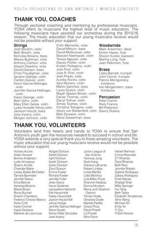Volunteers lend their hearts and hands to YOSA to ensure that San Antonio’s youth gain the resources needed to succeed in school and life. YOSA extends a very special thank you to these amazing volunteers. The music education that our young musicians receive would not be possible without your support. Victoria Acuùa Aidan Alcocer Bonnie Anderson Lydia Annayeva Sharon Arnold Chandler Baker Lesley Balido McClellan Tamara Bannister Jennifer Basso Erica Becvar Vanessa Briseno Blaine Bryan Rocia Bucheli Sharon Chambers Federico Chavez-Blanco Vicky Croft Karen Conner Kayla DeJesus Marlene de Leon-Lew