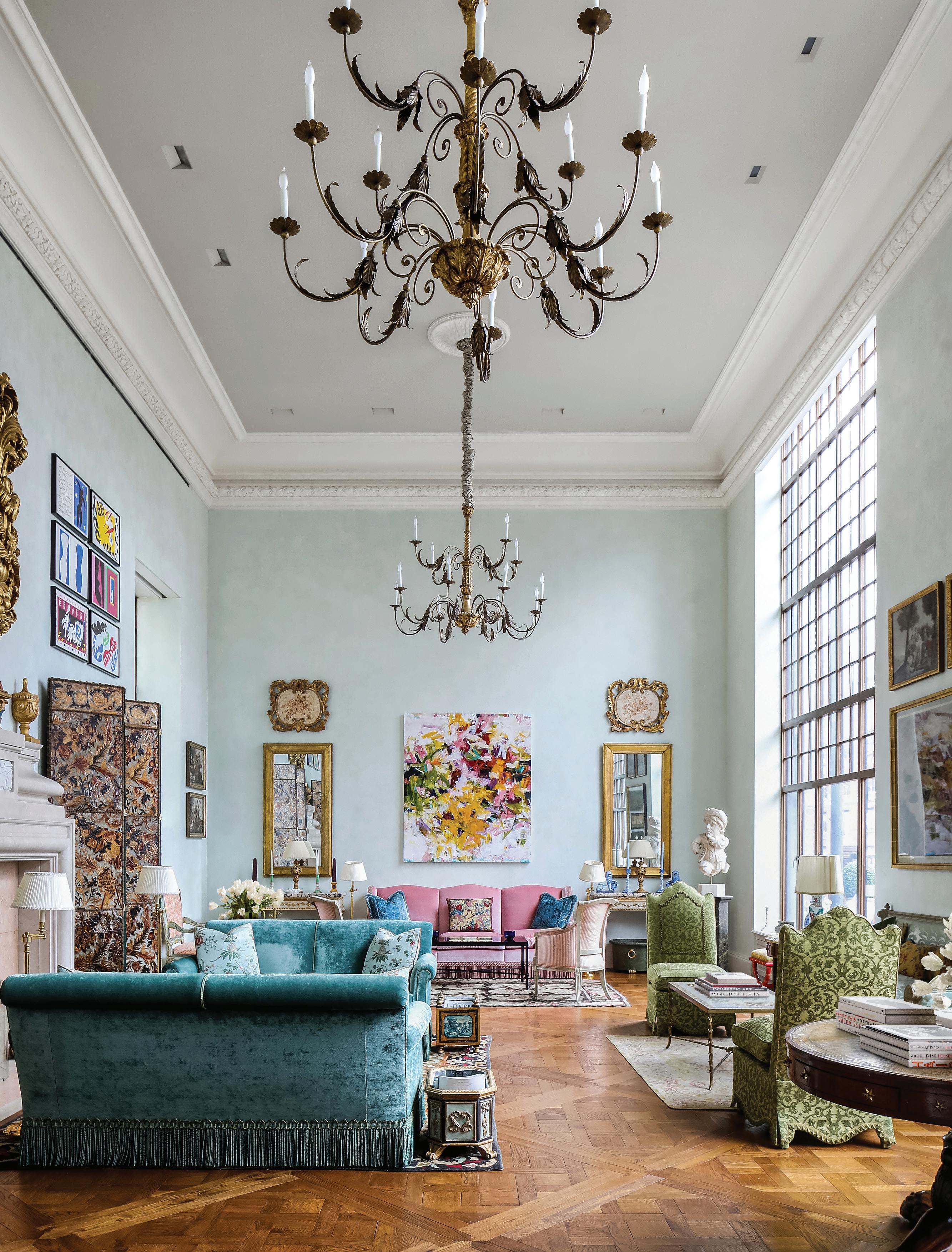 Situated on a townhouse block off Fifth Avenue, the home offers nine bedrooms, seven baths, three terraces, a garden, and 13-foot ceilings on the drawing room floor. A Neo-Classical limestone façade and gated garden forecourt were designed by architect Henry Andersen, inspired by the leading architectural firm of its time, McKim, Mead and White. The home’s most recent renovation was helmed by architect Steven Wang and interior designer Steven Gambrel. Turnof-the-century details have been preserved, including six marble fireplaces, inlaid flooring of various woods, intricate mold-ings, a wrought iron and brass balustrade and tall Ionic columns that frame the drawing room. The home’s garden floor opens to the grand entrance gallery featuring an inlaid marble and onyx floor, a sweeping staircase, a coat closet and a powder room.