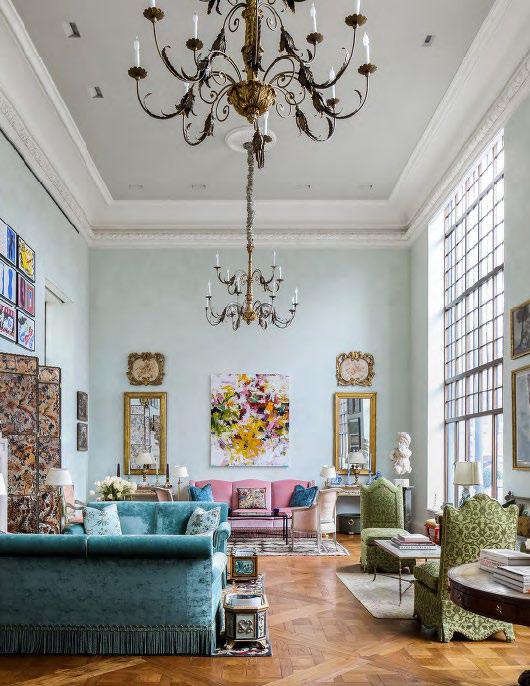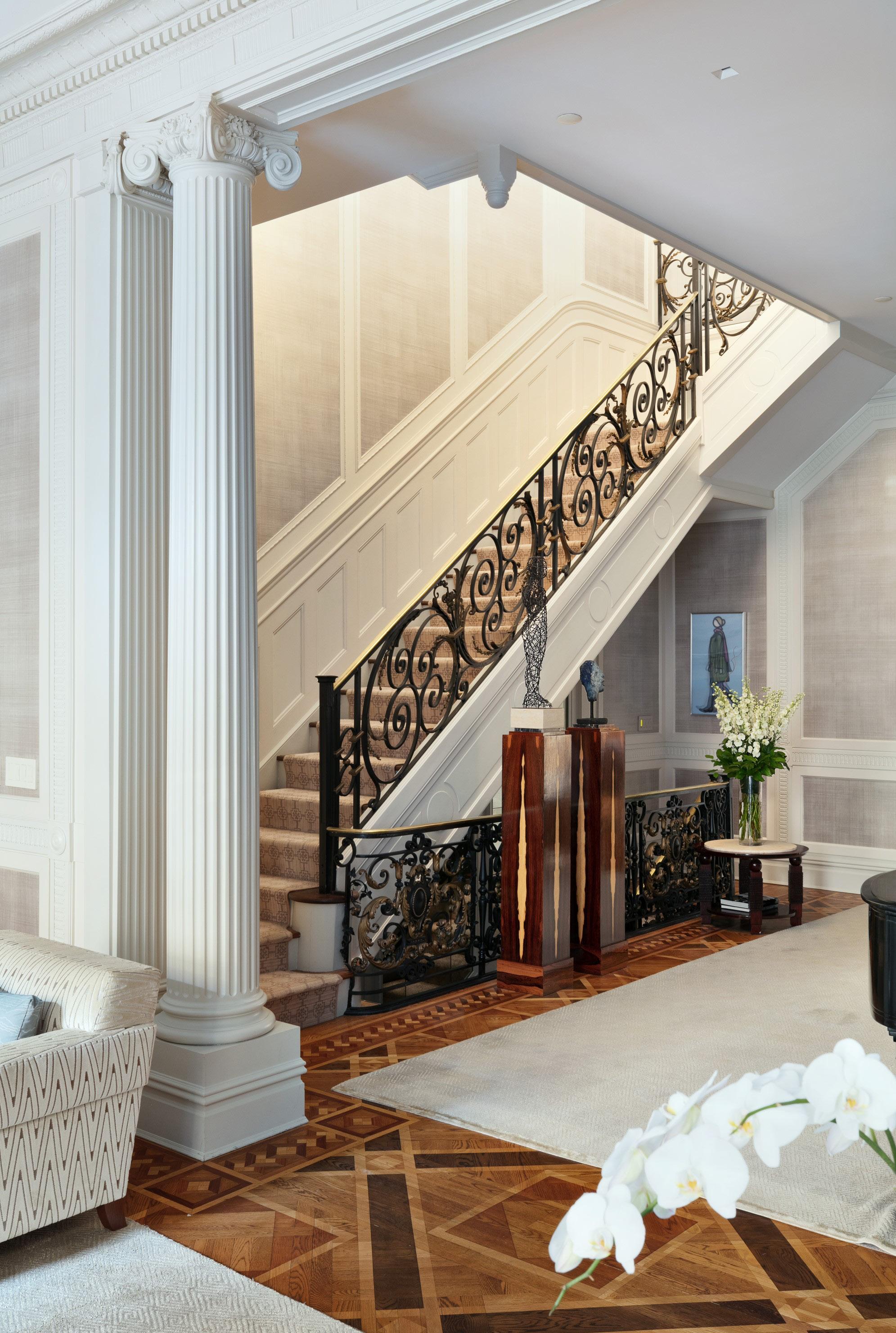 The home’s most recent renovation was helmed by architect Steven Wang and interior designer Steven Gambrel. Turn-of-the-century details have been preserved, including six marble fireplaces, inlaid flooring of various woods, intricate mold-ings, a wrought iron and brass balustrade and tall Ionic columns that frame the drawing room. The home’s garden floor opens to the grand entrance gallery featuring an inlaid marble and onyx floor, a sweeping staircase, a coat closet and a powder room.