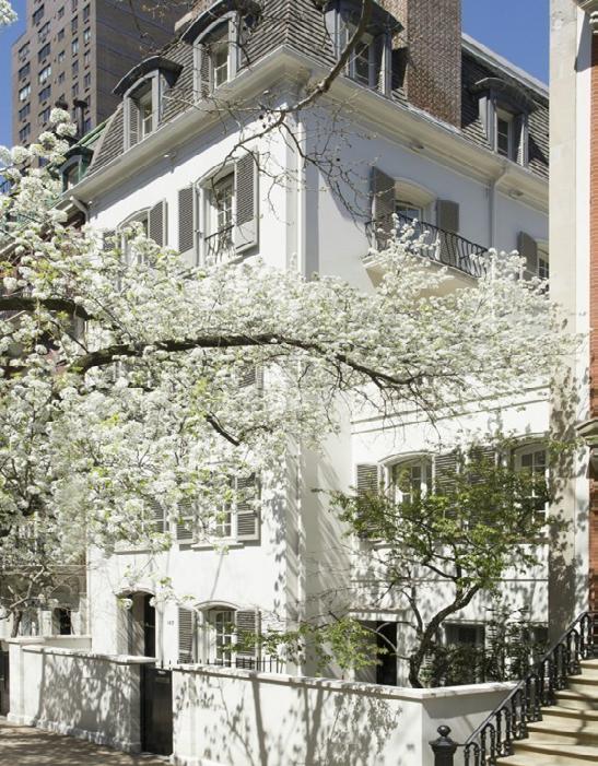 Situated on a townhouse block off Fifth Avenue, the home offers nine bedrooms, seven baths, three terraces, a garden, and 13-foot ceilings on the drawing room floor. A Neo-Classical limestone façade and gated garden forecourt were designed by architect Henry Andersen, inspired by the leading architectural firm of its time, McKim, Mead and White. The home’s most recent renovation was helmed by architect Steven Wang and interior designer Steven Gambrel. Turnof-the-century details have been preserved, including six marble fireplaces, inlaid flooring of various woods, intricate mold-ings, a wrought iron and brass balustrade and tall Ionic columns that frame the drawing room. The home’s garden floor opens to the grand entrance gallery featuring an inlaid marble and onyx floor, a sweeping staircase, a coat closet and a powder room.