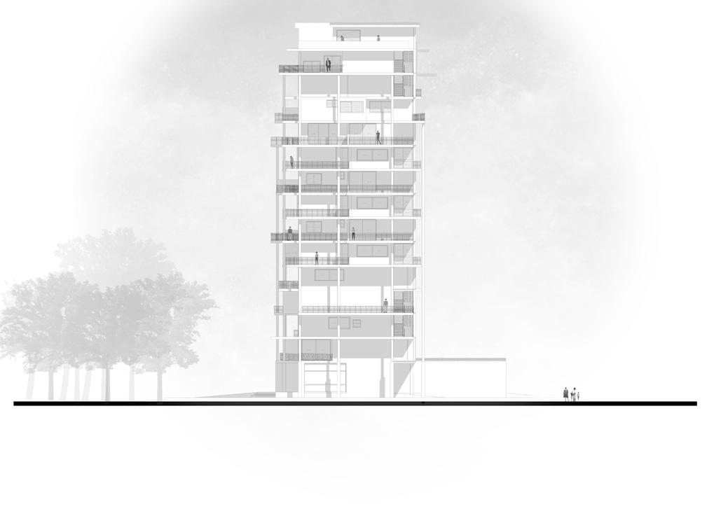 Pour ce projet, nous avons pensé un programme multifonctionnel composé à 50% de logements traversants et en duplex. La seconde partie de la tour abritera des fonctions diverses pour que cette tour nouvelle devienne un pôle d’activité majeur et multigénérationnel de la ville de Nîmes (des nourrissons en crèche, étudiants et adultes jusqu’aux résidents de la maison de retraite à l’échelle de la ville horizontale). Pour répondre aux problèmes de surchauffe rencontrés lorsque la tour fut en fonction, nous avons décidé de prolonger les planchers afin de créer des débords de plancher qui protègeront du soleil en été et illumineront les pièces en hiver ce qui composera l’identité architecturale et structurelle principale de la tour.