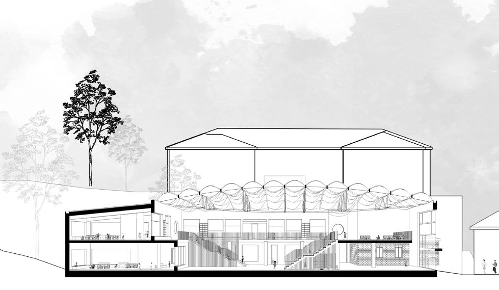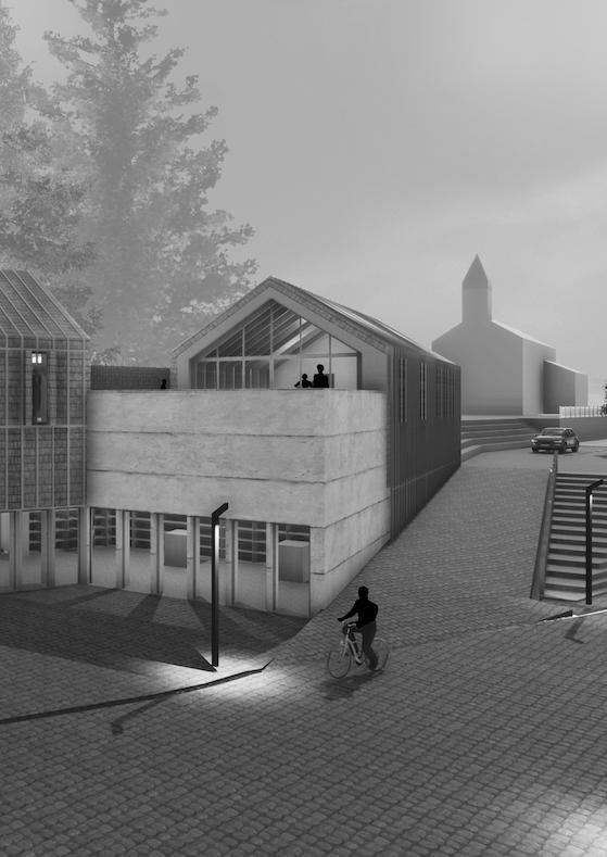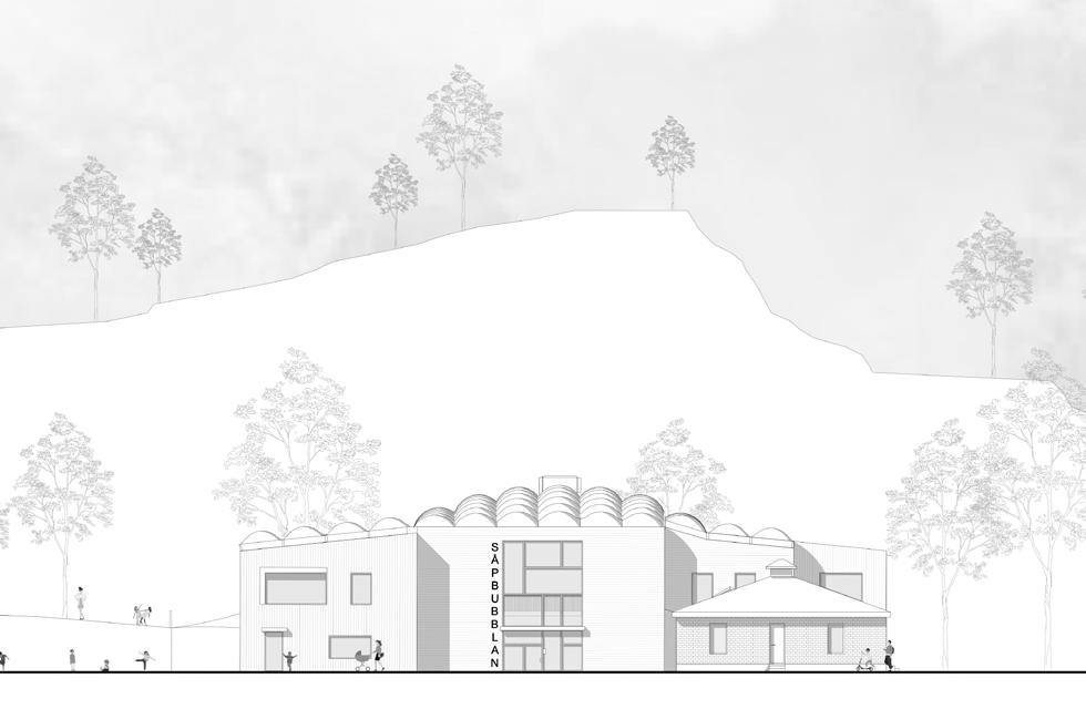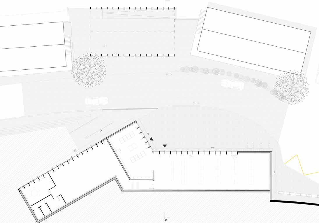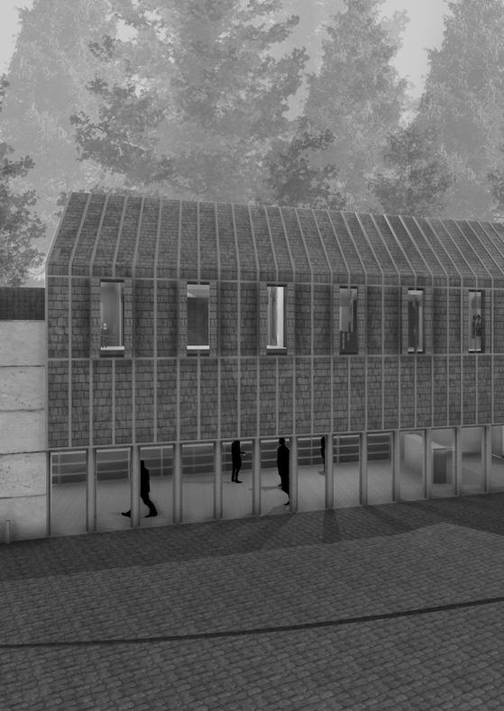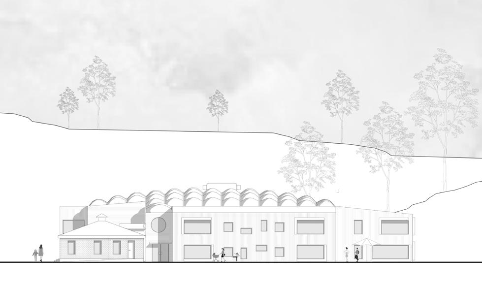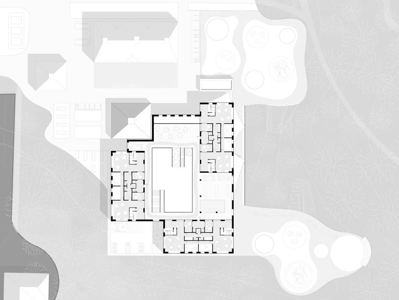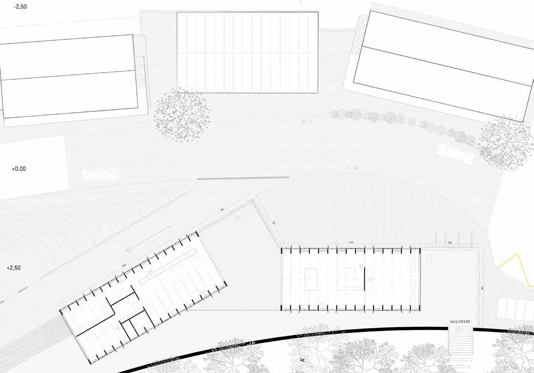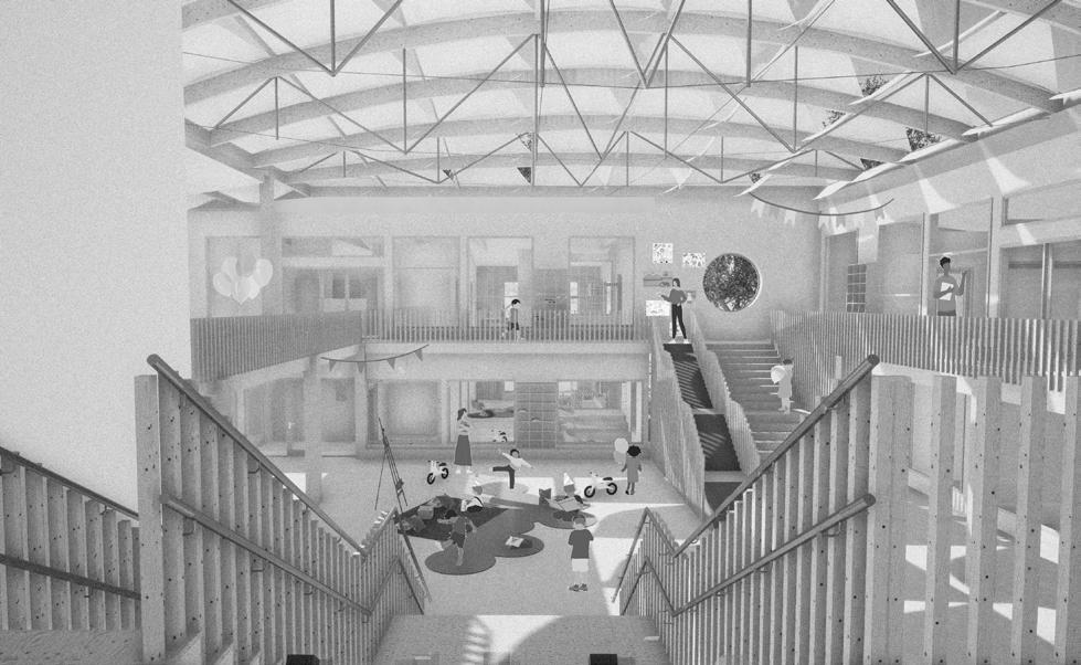 L’enjeu premier du projet est l’orientation des volumes permettant un ensoleillement optimal pour chacune des unités d’enseignement, ainsi que pour les circulations et les salles d’activités (gym, bibliothèque, vestiaires) au RDC et au R+1. Le projet est caracterisé par un atrium en ETFE, offrant un espace de récréation intérieur pour les jours de pluie et de froid intense, caractéristique de la région. Cette disposition donne naissance à une cour intérieure couverte, avec 1 unité, des vestaires, un espace enseignants et la salle de gymnastique. Au R+1, 3 unités d’enseignements et des espaces communs.