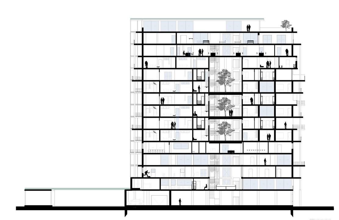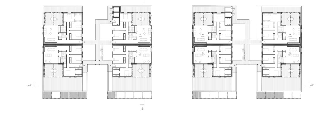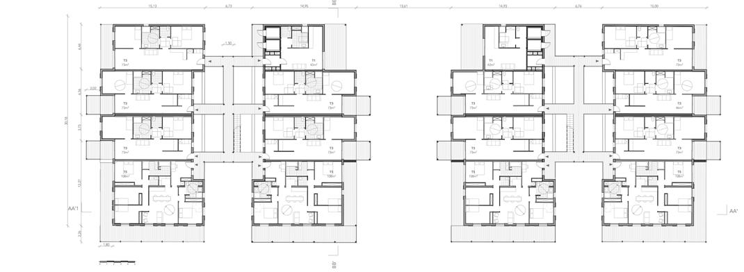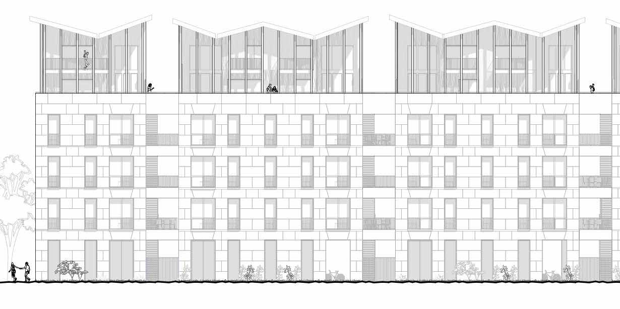 Les circulations verticales mènent à des passerelles au nombre de 4, superposées, chaque branche desservant un maximum de 2 logements dans une volonté d’individualisation des entrées. Ce projet dispose d’une triple matérialité : un socle en béton pour la massivité, suivit de 3 niveaux (R+1 au R+3) munis d’un revêtement en bardage bois et enfin un revêtement en bardage aluminium en attique (R+4) pour marquer le dernier niveau avec légèreté.