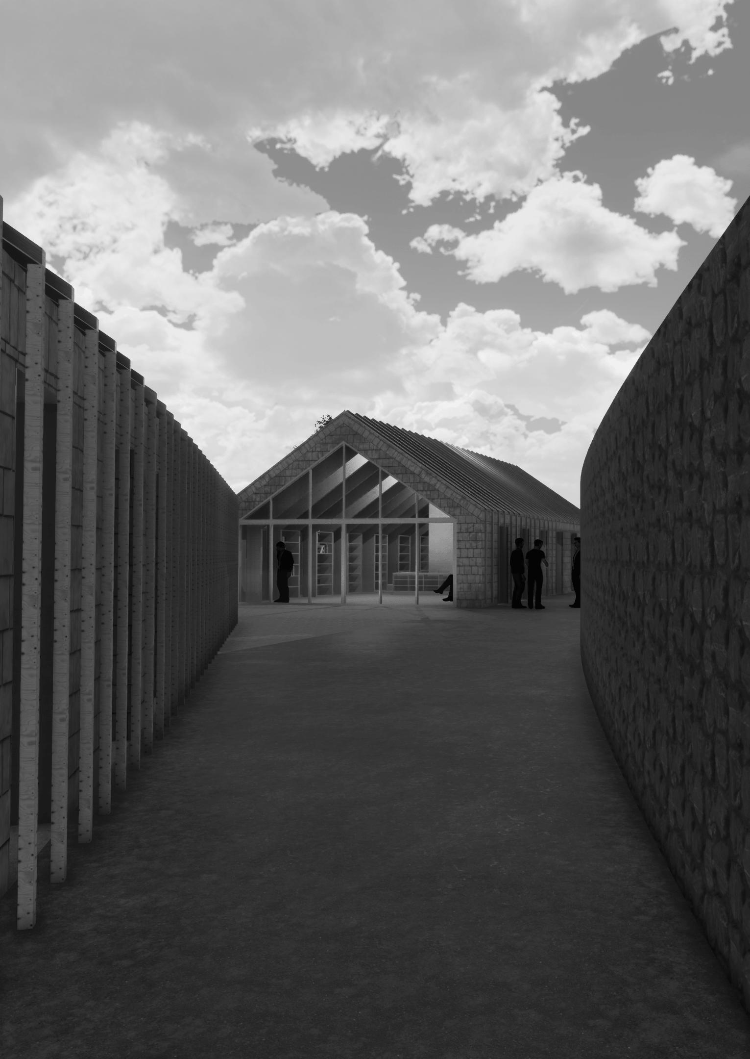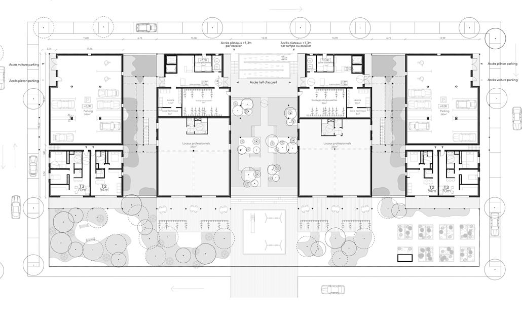 Dans ce projet, l’habitant retrouvera la place qu’il a perdu au détriment de la voiture dans le temps. Diverses échelles seront mobilisées : l’échelle territoriale, l’échelle du village et l’échelle du projet. Les filières locales seront mises en avant : matériaux et savoir faire locaux aux circuits courts (tavaillon bois de châtaignier, portiques en pin maritime...) et vente de produits locaux. Le bois et le béton de site mêleront expressivité structurelle et architecturale forte. Le bois apporte au projet une intégration respectueuse de l’image du village tout en favorisant les performances thermiques, accoustiques et lumineuses de celui-ci. Alès