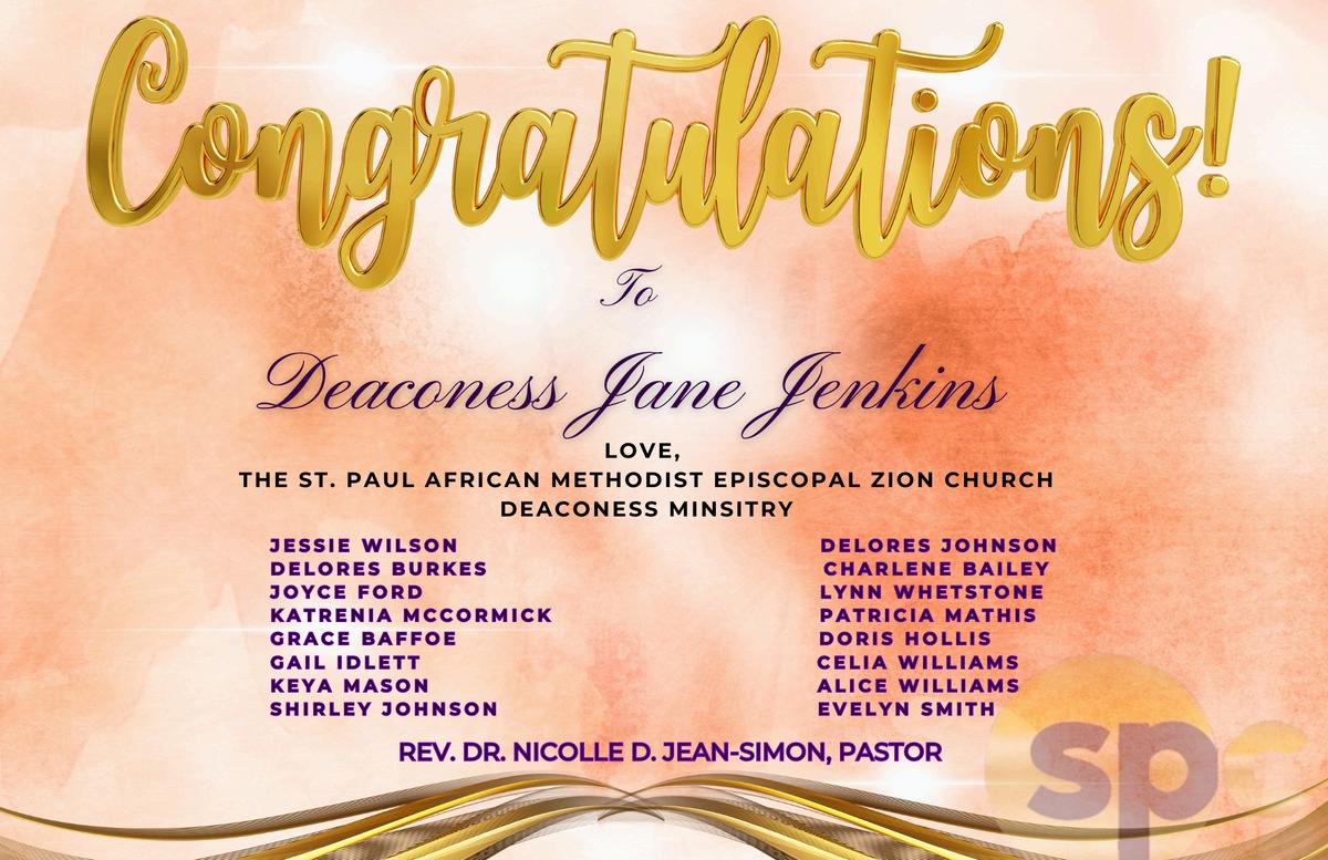 Jane has been a member of St. Paul A.M.E. Zion Church for 60 plus years. She has served in many capacities such as Usher, Nursing Ministry, Stewardess, Deaconess, Laity Council, Willing Workers Ministry and served as the Women’s Day Chair, just to name a few.