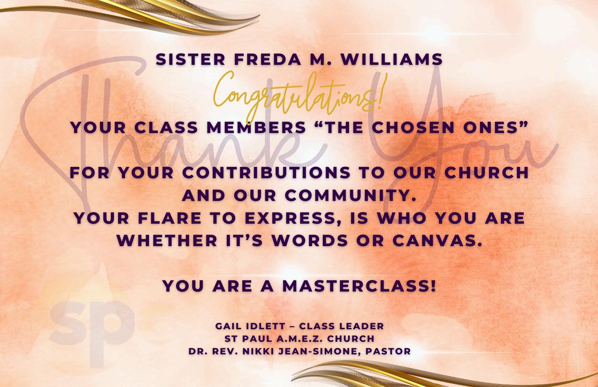 In addition to her artistic pursuits, Freda has made significant contributions to her community through her leadership roles. As Director of the St. Paul Golden Arts Ministry, she has provided senior members with opportunities to discover and share their artistic talents. The ministry’s first Golden Arts Exhibit, held on October 20, 2019, was a tremendous success and showcased the hidden talents of St. Paul AME Zion Church members. Freda is also the Director of the St. Paul Political Action & Voter Engagement Ministry, which she organized in 2017 under the theme "Souls to the Polls." This ministry is dedicated to promoting voter registration, raising awareness about the importance of elections, and educating both youth and adults about the history of voting in America. Through her leadership, Freda continues to champion the importance of civic engagement and advocacy, ensuring that the struggles and triumphs of African American citizens in the electoral process are never forgotten.