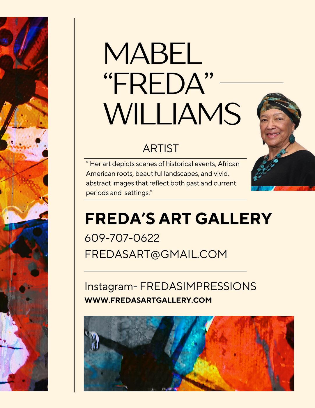 Mabel "Freda" Williams has been a cherished resident of the Trenton area and Ewing Township for over seventy years. Originally from North Carolina, Freda has had a passion for art since the age of ten. Her paintings are vibrant expressions of color that capture nostalgic memories, cultural experiences, and political impressions. Over the years, Freda has expanded her artistic repertoire to include watercolor and mixed media, and she enjoys experimenting with various surfaces, such as wood, glass, and burlap fabric.