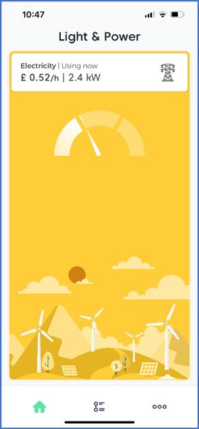 When the oven was then switched on at 10:47, immediately the monitor shows a higher usage of 2400 Watts (2.4kW) at 10.47am, rising to 52p per hour