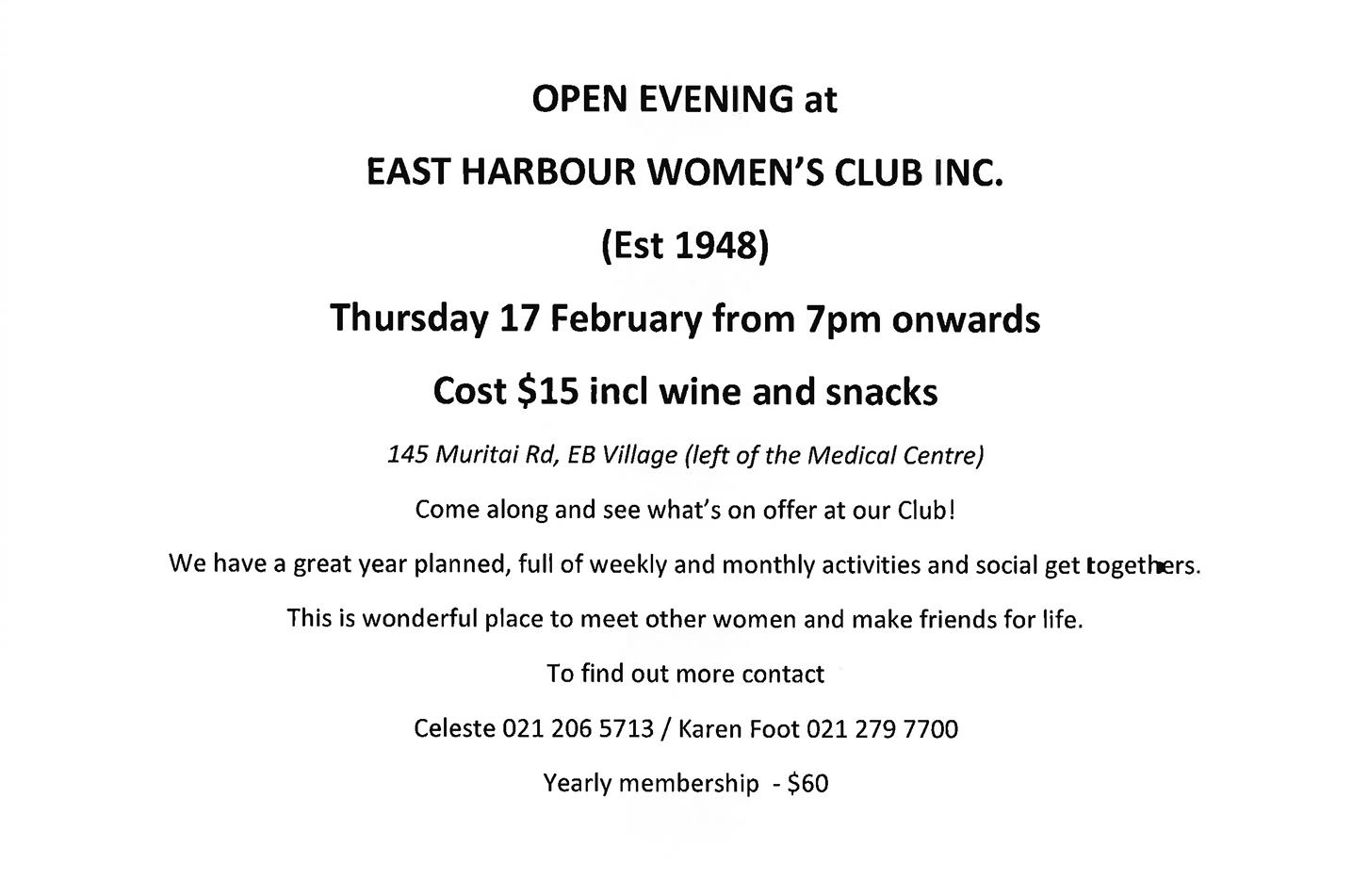 • East Harbour Women’s Club Morning Tea & Chat Group 10am. Contact Glendyr 562 7181.