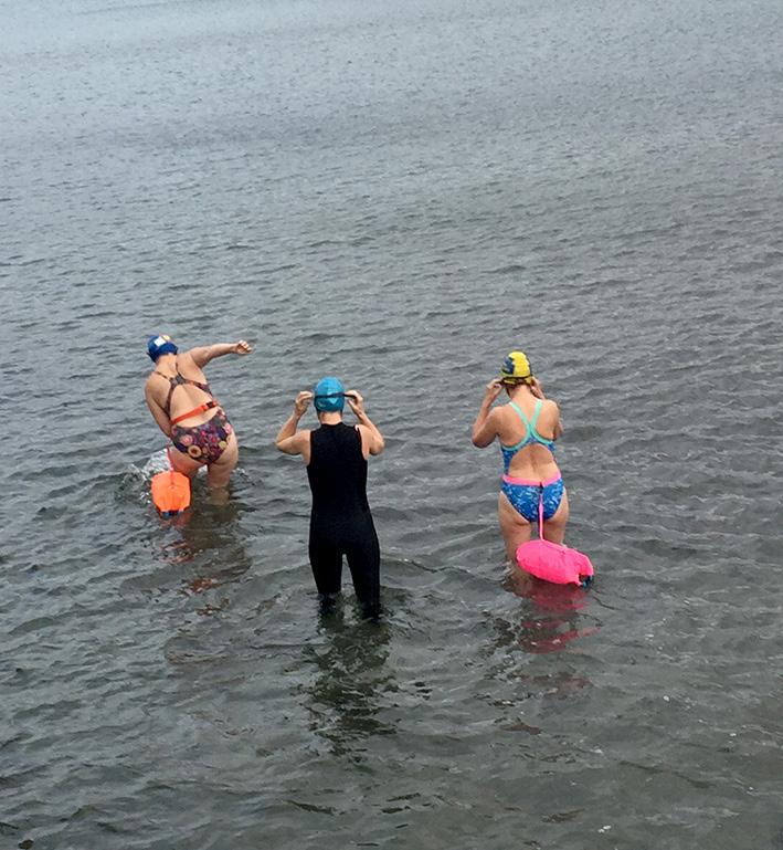 What began as a midwinter dip turned into serious training for the annual Wharf to Wharf swim. Then October-to-Easter swimming stretched to year-round for the trio, who are joined by others on occasion. Two have shed the wetsuits that got them started but they still swear by neoprene undercaps with ear flaps, to keep their heads warm. They also wear neon towfloats which make them easy to see in the water – adding lights when a full-moon night swim is planned.