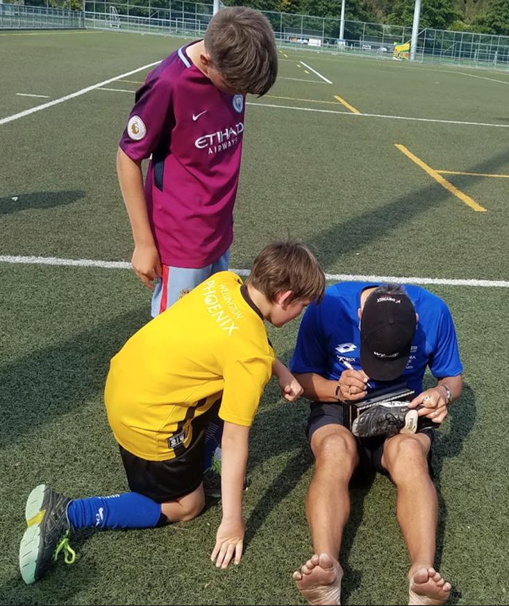 Eastbourne FC 10th Grader, James Allcock, seen having Oceania Player of the Century, Wynton Rufer, sign his old Puma boot.