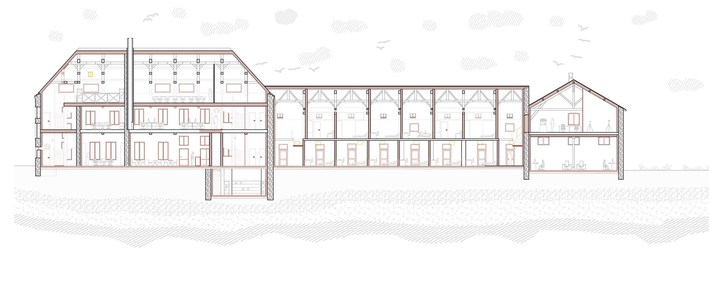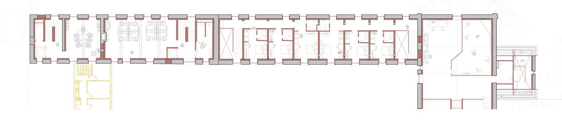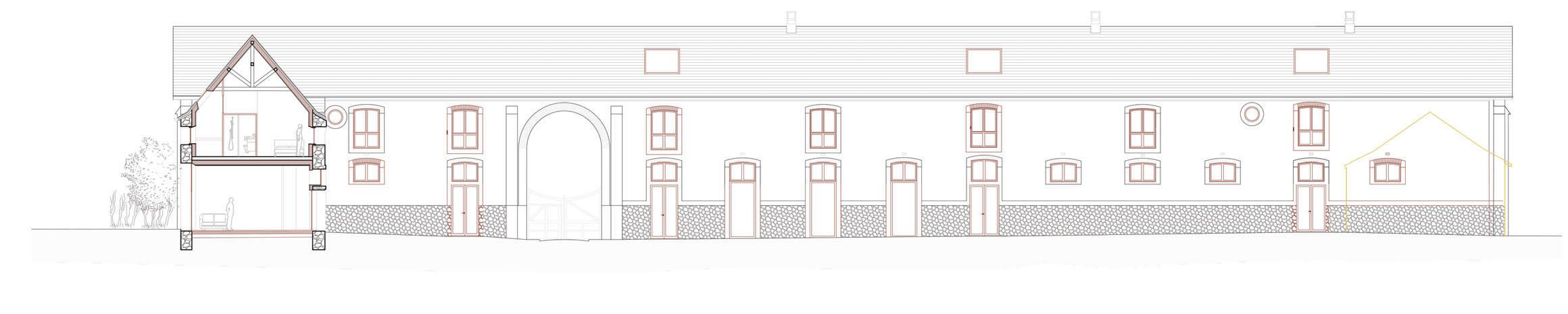 Sélection de travaux 11 élévation nord-ouest 1:150 coupe longitudinale 1:150 logis, écuries plan R+1 1:200 Lo L gementts poour artisstetes Lo Local asso s ciatif Sa S lle de réuuninioon R+1 élévation nord-ouest coupe longitudinale