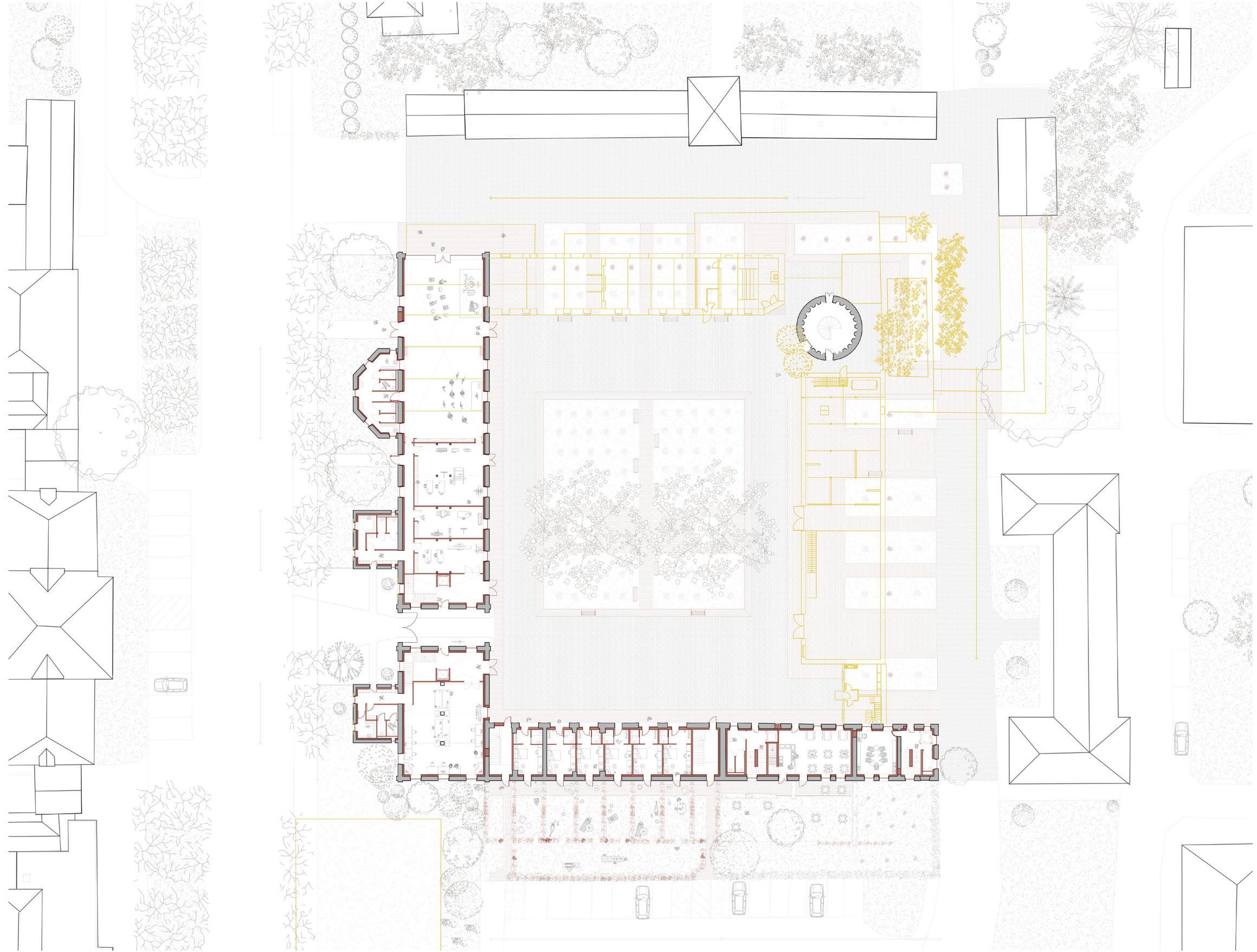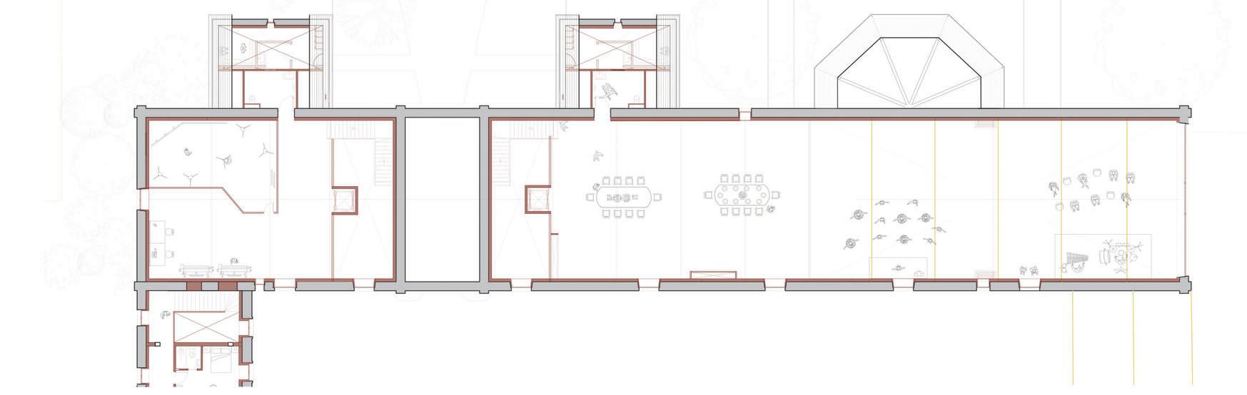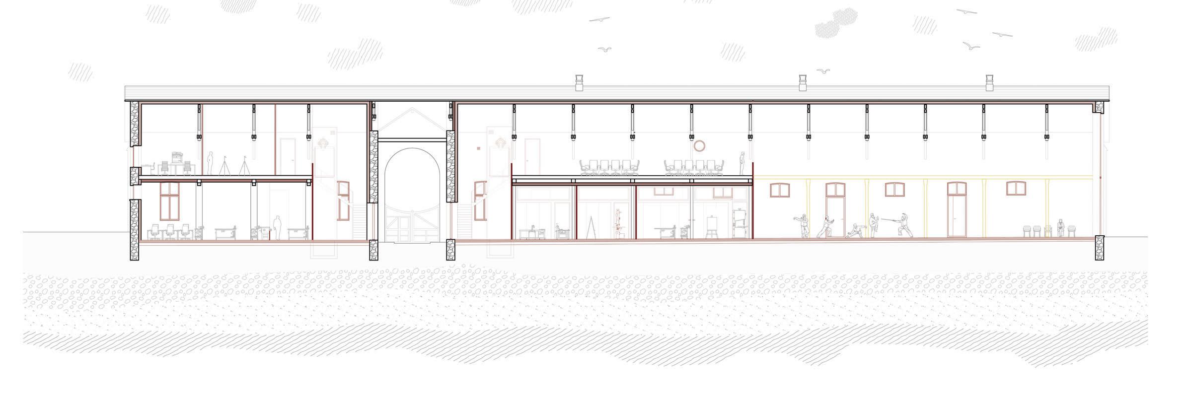 L’idée est d’en faire un programme public en lui donnant une fonction de parvis couvert, qui accueille par un grand escalier menant au premier étage, étant l’étage de réception du public.