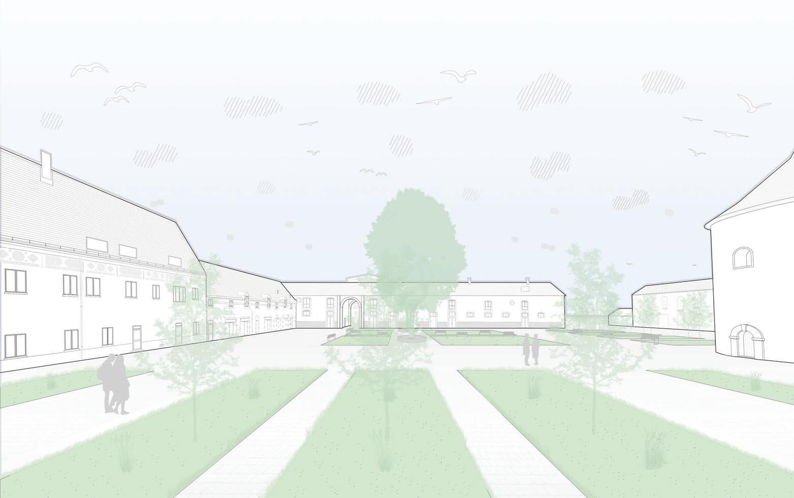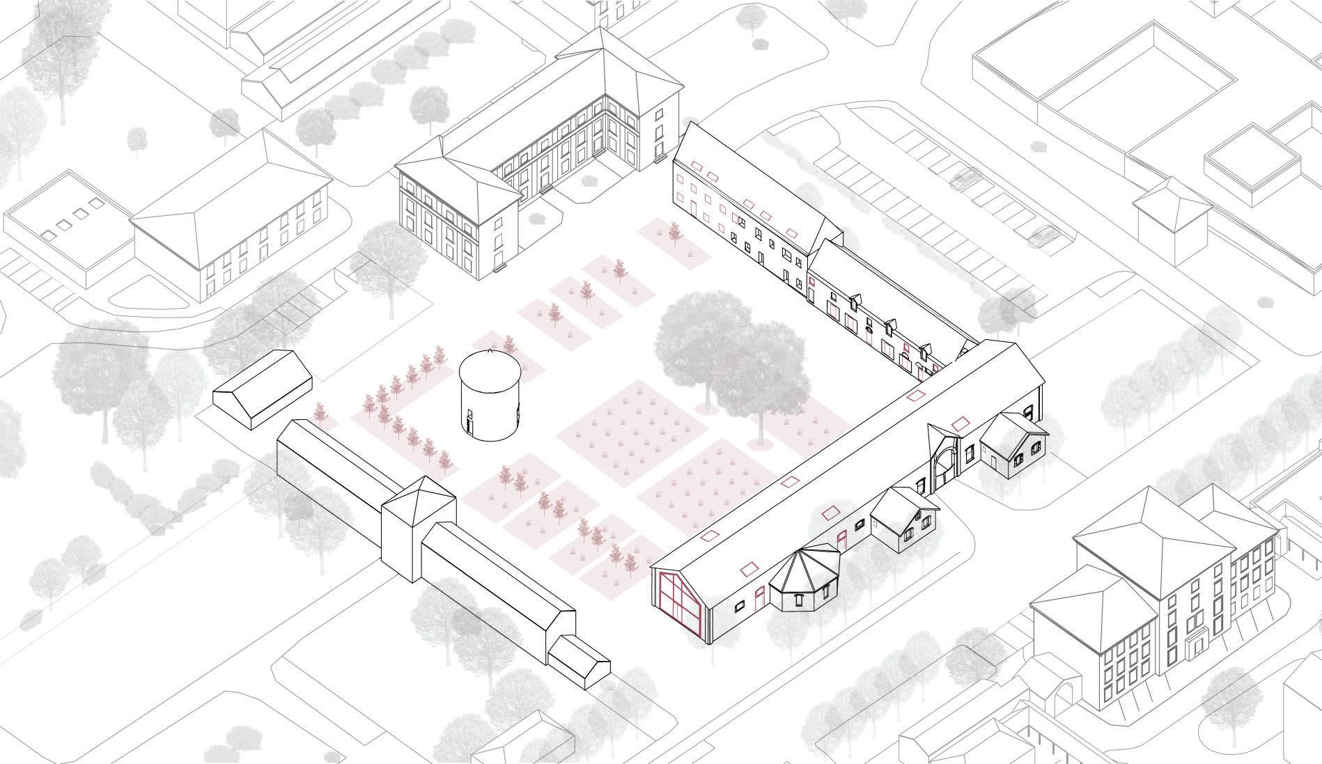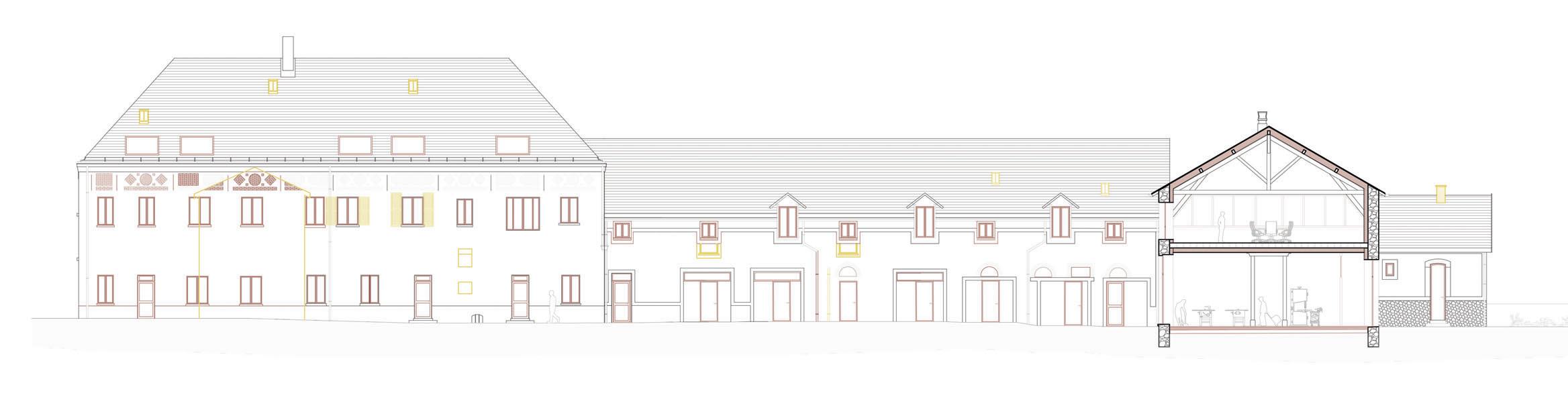 Pour ce faire, plusieurs modifications sont à prévoir, comme la démolition de deux ailes, l’une composée de plusieurs bâtiments en ruine et l’autre d’une ancienne grange. Pour ainsi créer un nouvel accès direct depuis l’allée principale du site, agrandir la cour et créer des percées visuelles permettent ainsi de mettre un lien certains bâtiments avoisinant actuellement isolé. Certaines touches contemporaines viennent se mêler à l’ancien comme l’ouverture d’un pignon de l’ancienne étable et le remplacement de toutes les menuiseries. L’idée est d’apporter quelques changements dans l’air du temps, mais de préserver au maximum le caractère originel du lieu. Des modifications extérieures sont effectuées sur une grande partie de la cour pour la végétaliser et l’équiper de mobilier urbain.