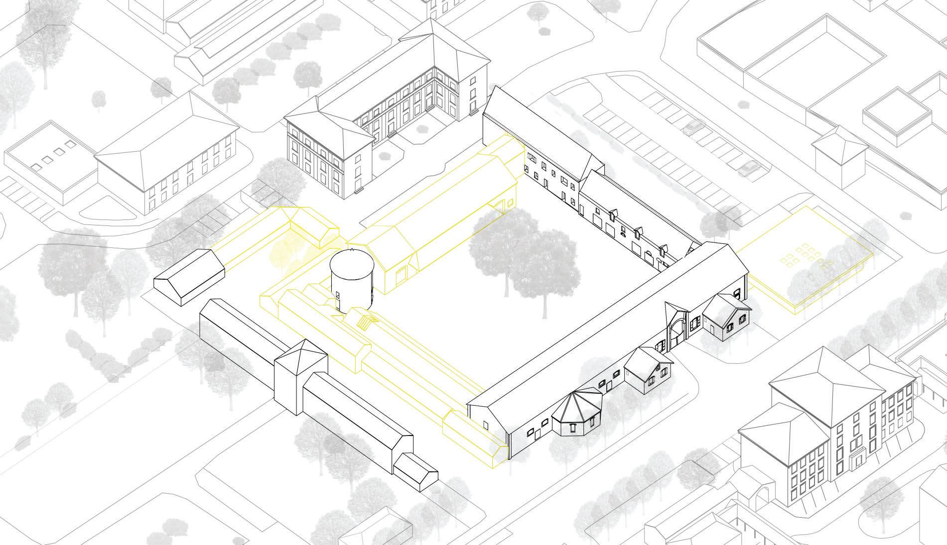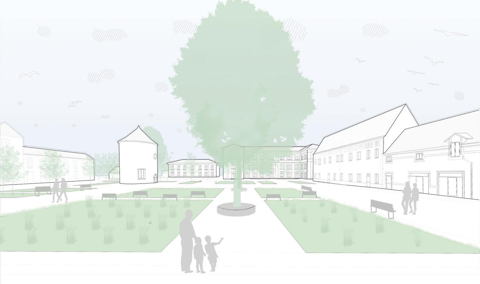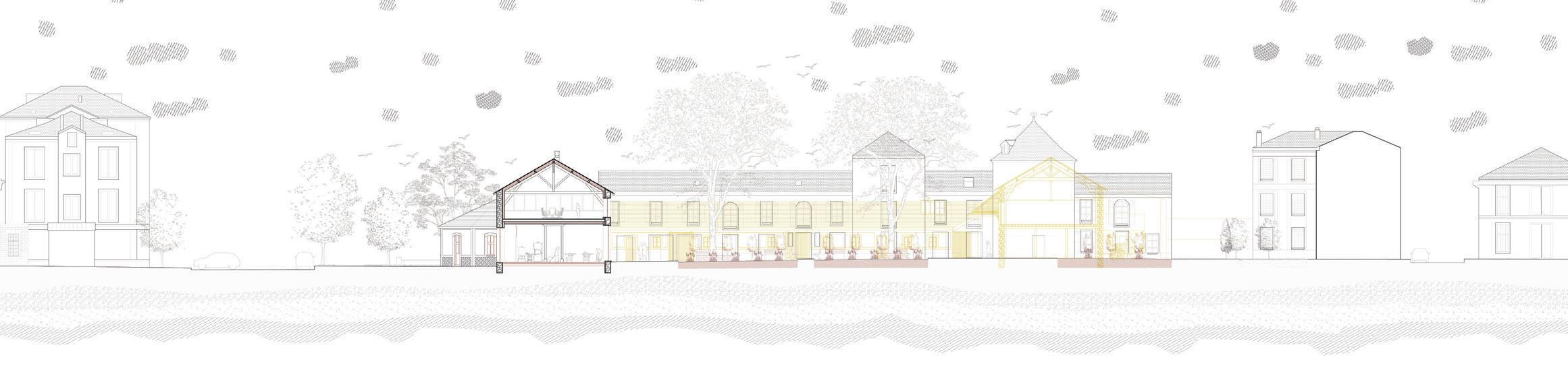 Pour ce faire, plusieurs modifications sont à prévoir, comme la démolition de deux ailes, l’une composée de plusieurs bâtiments en ruine et l’autre d’une ancienne grange. Pour ainsi créer un nouvel accès direct depuis l’allée principale du site, agrandir la cour et créer des percées visuelles permettent ainsi de mettre un lien certains bâtiments avoisinant actuellement isolé. Certaines touches contemporaines viennent se mêler à l’ancien comme l’ouverture d’un pignon de l’ancienne étable et le remplacement de toutes les menuiseries. L’idée est d’apporter quelques changements dans l’air du temps, mais de préserver au maximum le caractère originel du lieu. Des modifications extérieures sont effectuées sur une grande partie de la cour pour la végétaliser et l’équiper de mobilier urbain.