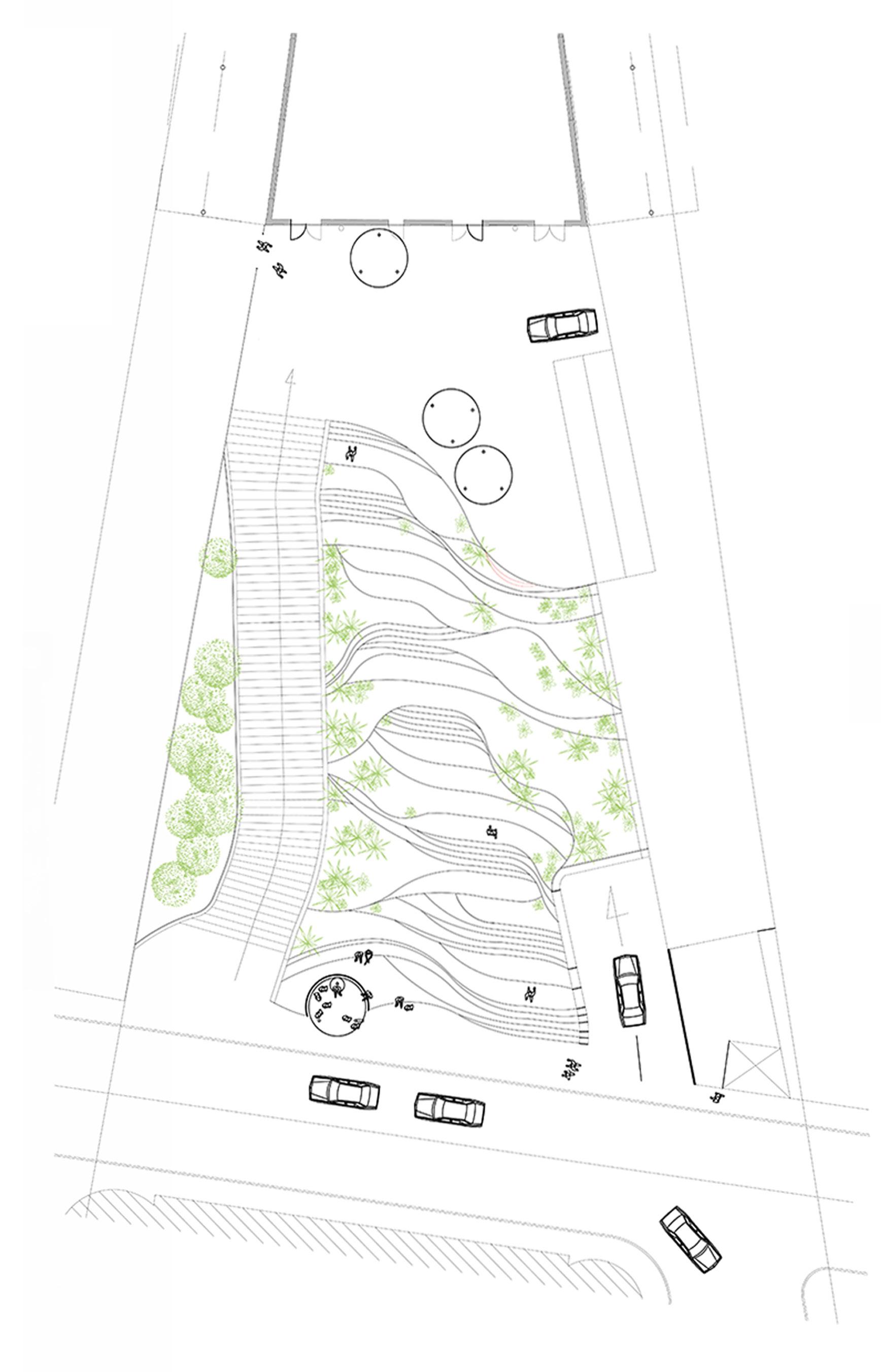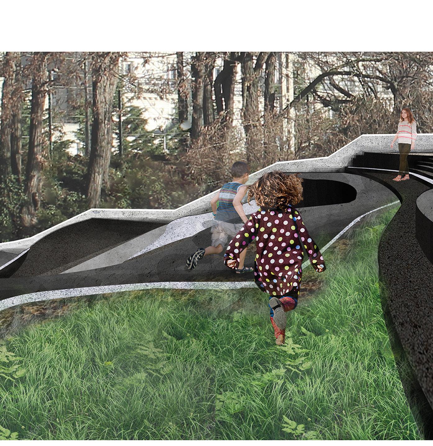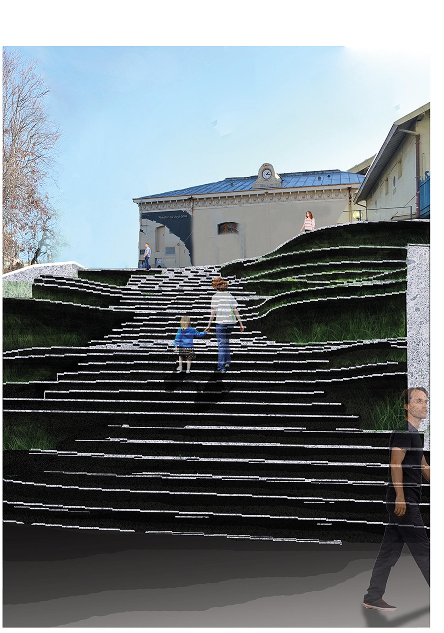 -Rythmé le déplacement du corps par un double rythme de marches et de gradins. Les marches permettent un rythme régulier aux passagers pressés. Opposé à cet escalier, les gradins proposent un second rythme de déambulation. Un rythme appropriable par chacun alternant jeux dynamiques pour les enfants et espace de repos.