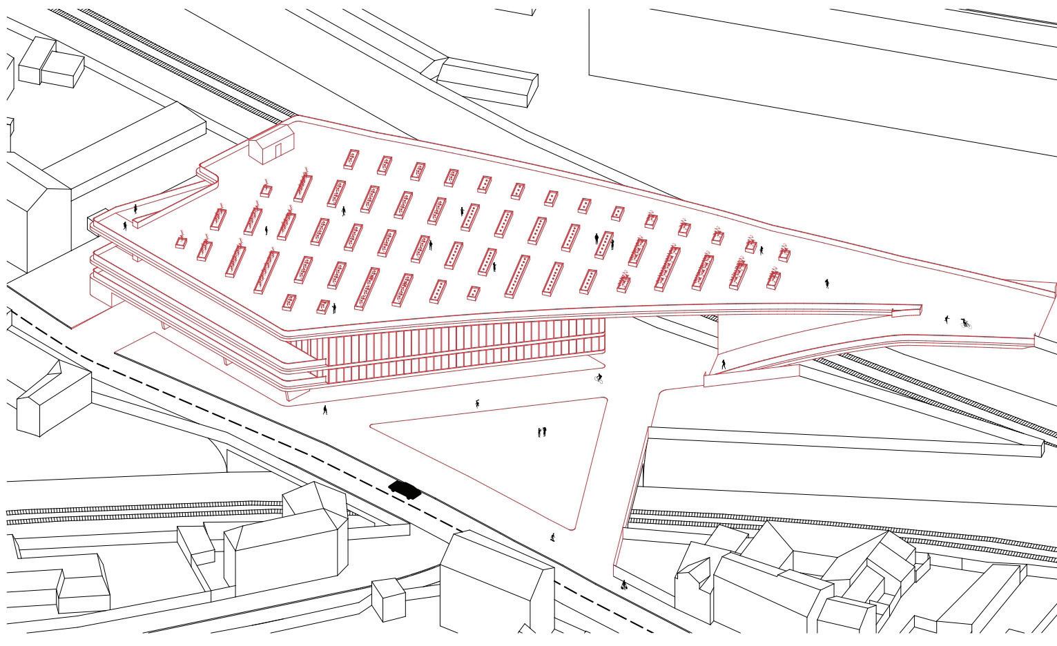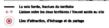L’objectif était donc de créer une nouvelle liaison entre ces 2 terri toires qui mènerait directement au site du projet et dont la voiture serait exclue. En effet, cette liaison se ferait à pied ou à vélo. Les habi tants du grand ensemble situé en bord de voie ferrée et les habitants des lotissements résidentiels situés plus à l’ouest seraient les principaux concernés. Cette liaison amenant, par conséquent, de nouvelles populations. Ceci permettrait également de concevoir un lieu d’attraction, d’échange et de partage destiné à tous.