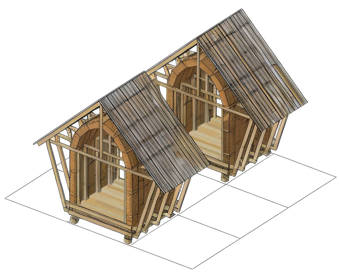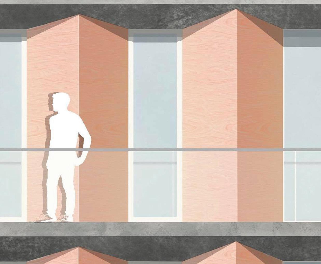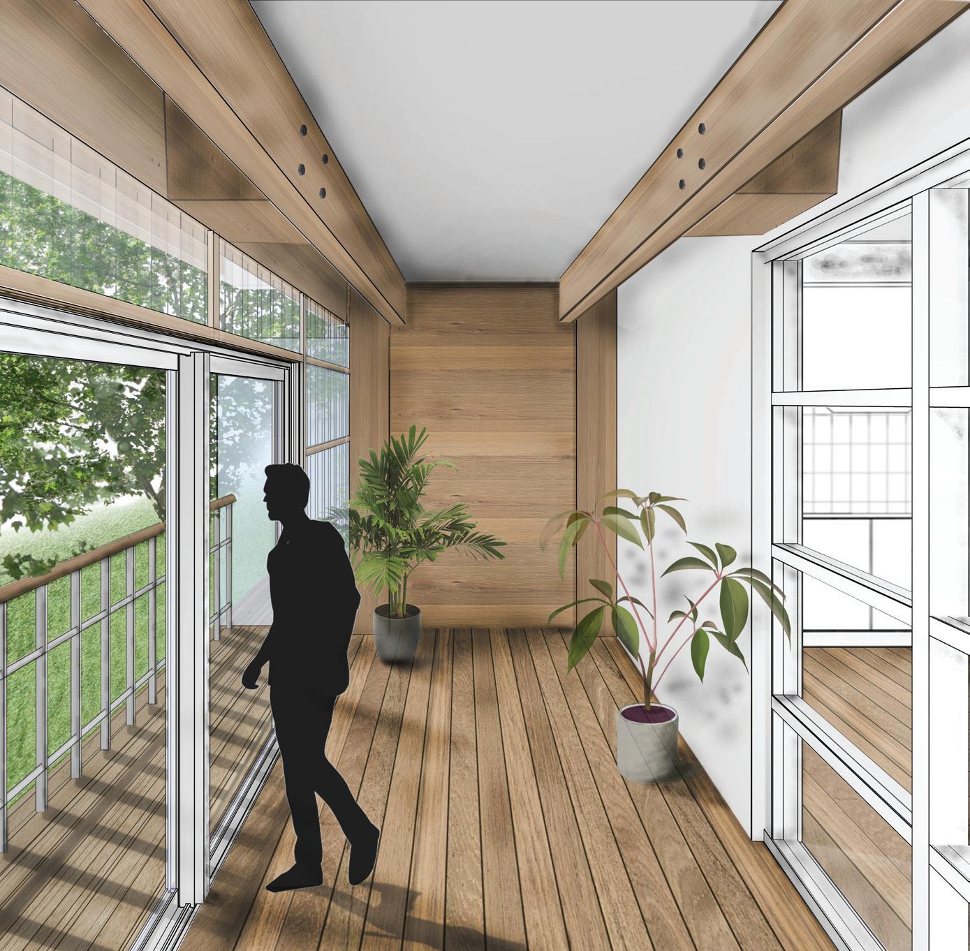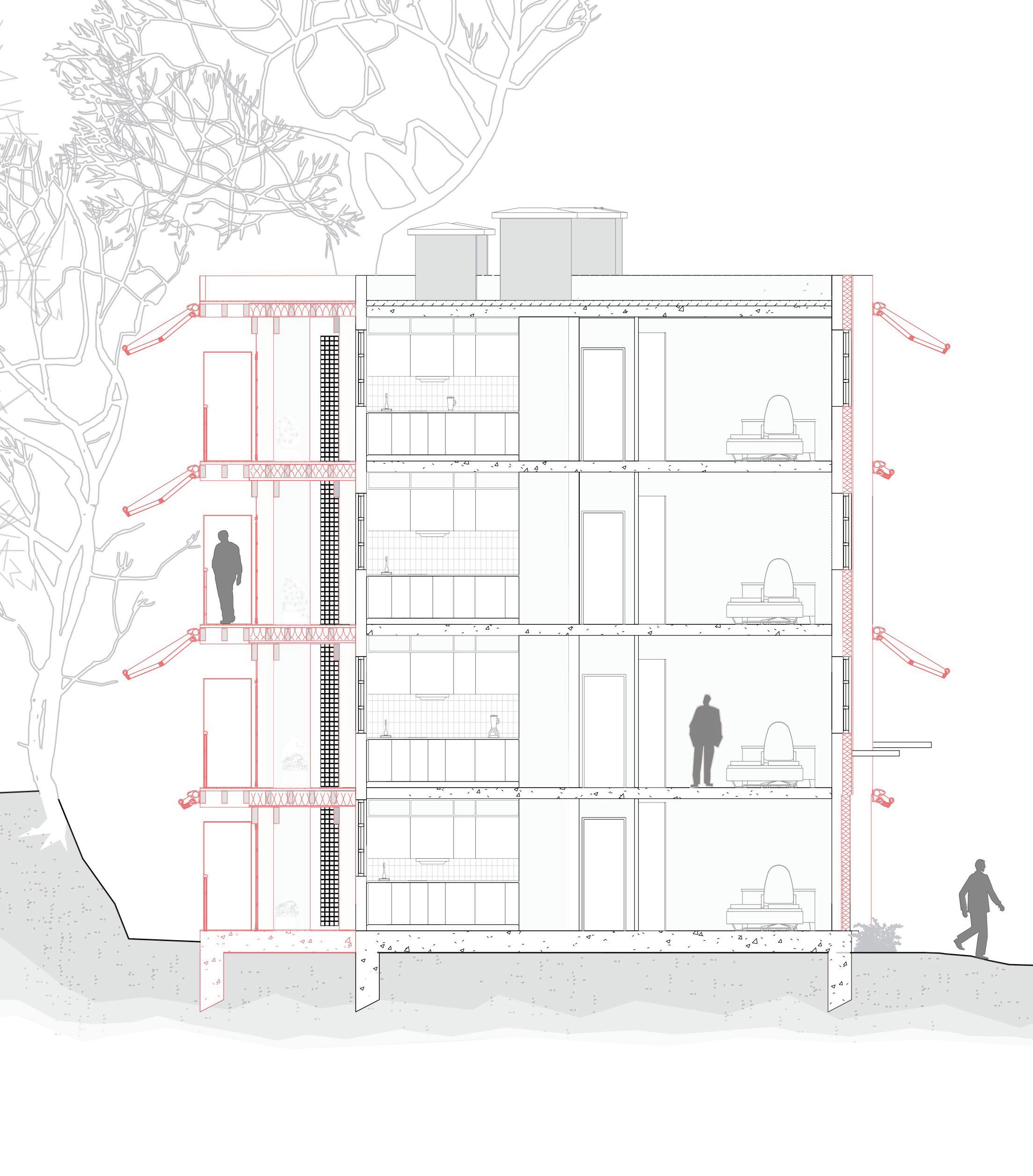 Ce projet est essentiellement porté sur l’enjeu thermique, afin de protéger ces bâtiments de l’humidité et du froid. La façade ouest, la plus exposée à l’humidité est protégée par la création d’une extension autoportante en structure bois avec des balcons continus, et est complétée par deux autres extensions au nord-est et sud-est. Ce qui permet également d’unifier les deux bâtiments, de supprimer tous les nombreux décalages inutiles en façade, pour simplifier le bâtiment. Des protections solaires extérieures variables, de type store à projection, sont installées pour éviter un excès de rayonnement solaire en été. Et peuvent t’être totalement rabattue en hiver pour en profiter au maximum. Les arbres sont en majorités caduques et permettent également en partie, en été de laisser passer le rayonnement et en hiver de la filtrer.