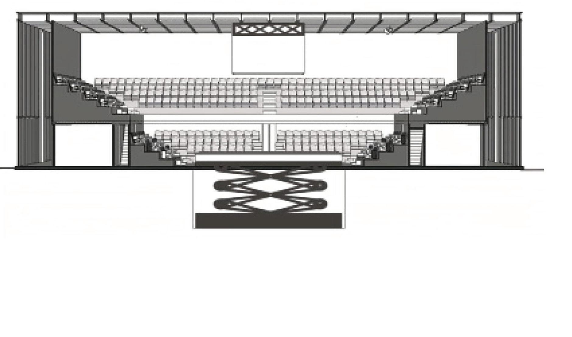 La scène pourrait se déplacer aux hauteurs des plateformes d’échafaudages grâce à un système de vérins, et occupe donc toute la salle de représentation. Cette scène dynamique permet d’engager le public dans la pièce et en particulier la performance.