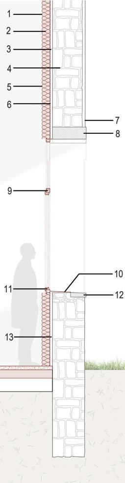 1 2 3 4 5 6 7 - Plaque de plâtre - Laine de chanvre - Traverse bois - Moellons - Pare-vapeur - Pare-pluie HPV - Enduit à la chaux 8 9 10 11 12 13