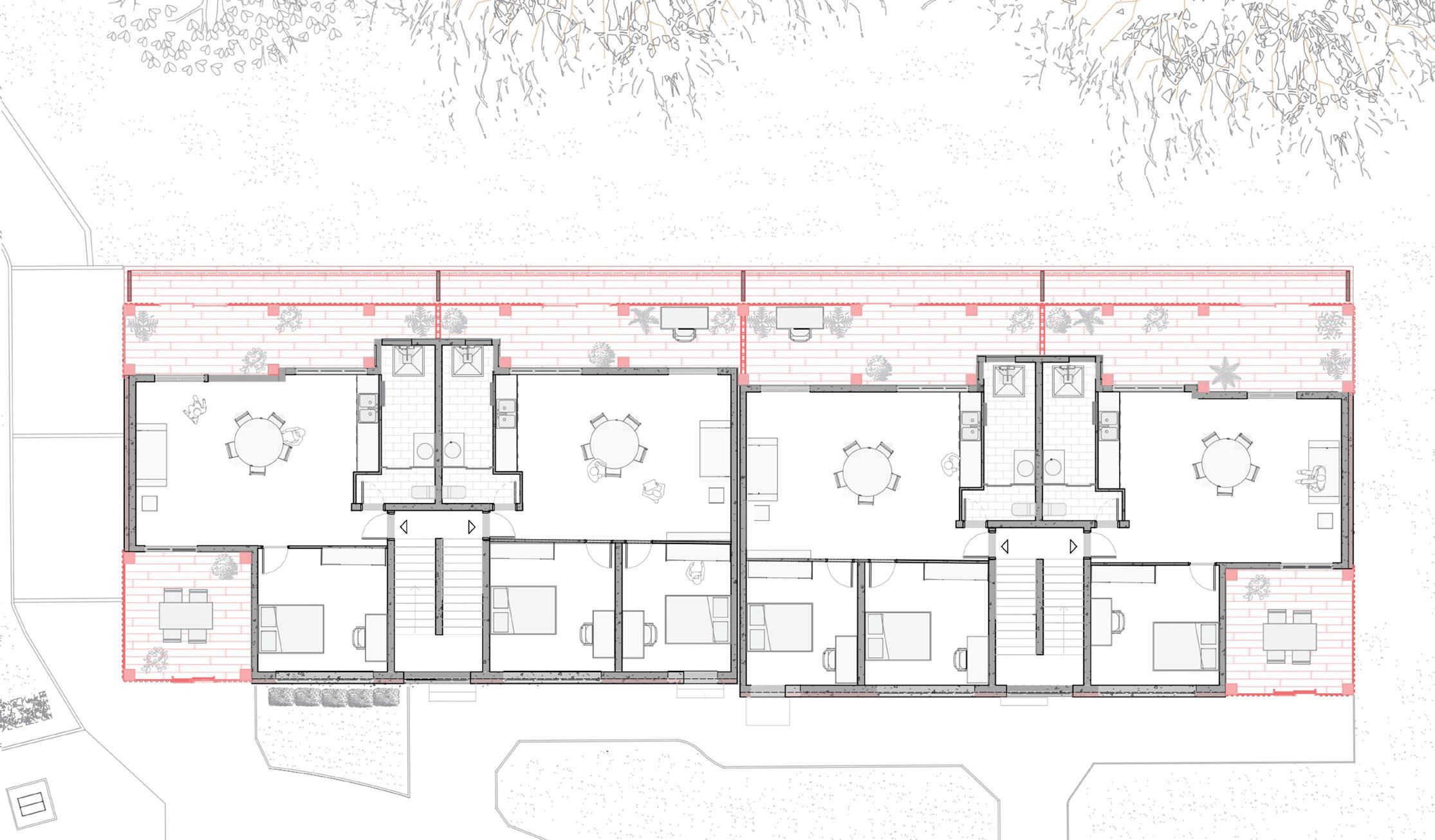 Dans le quartier de la Butte rouge à Châtenay-Malabry, nous devions proposer une solution pour une réhabilitation respectueuse de l’ensemble presque centenaire. Nous devions choisir 6 logements à réhabiliter. J’ai choisi deux bâtiments accolés datant de la première tranche de construction, car c’est la tranche de construction qui a le moins bien vieilli. J’ai choisi particulièrement ces bâtiments, car j’ai trouvé leur implantation très particulière par rapport aux autres bâtiments de la même tranche. Ils sont isolés et positionnés en lisière de la forêt.