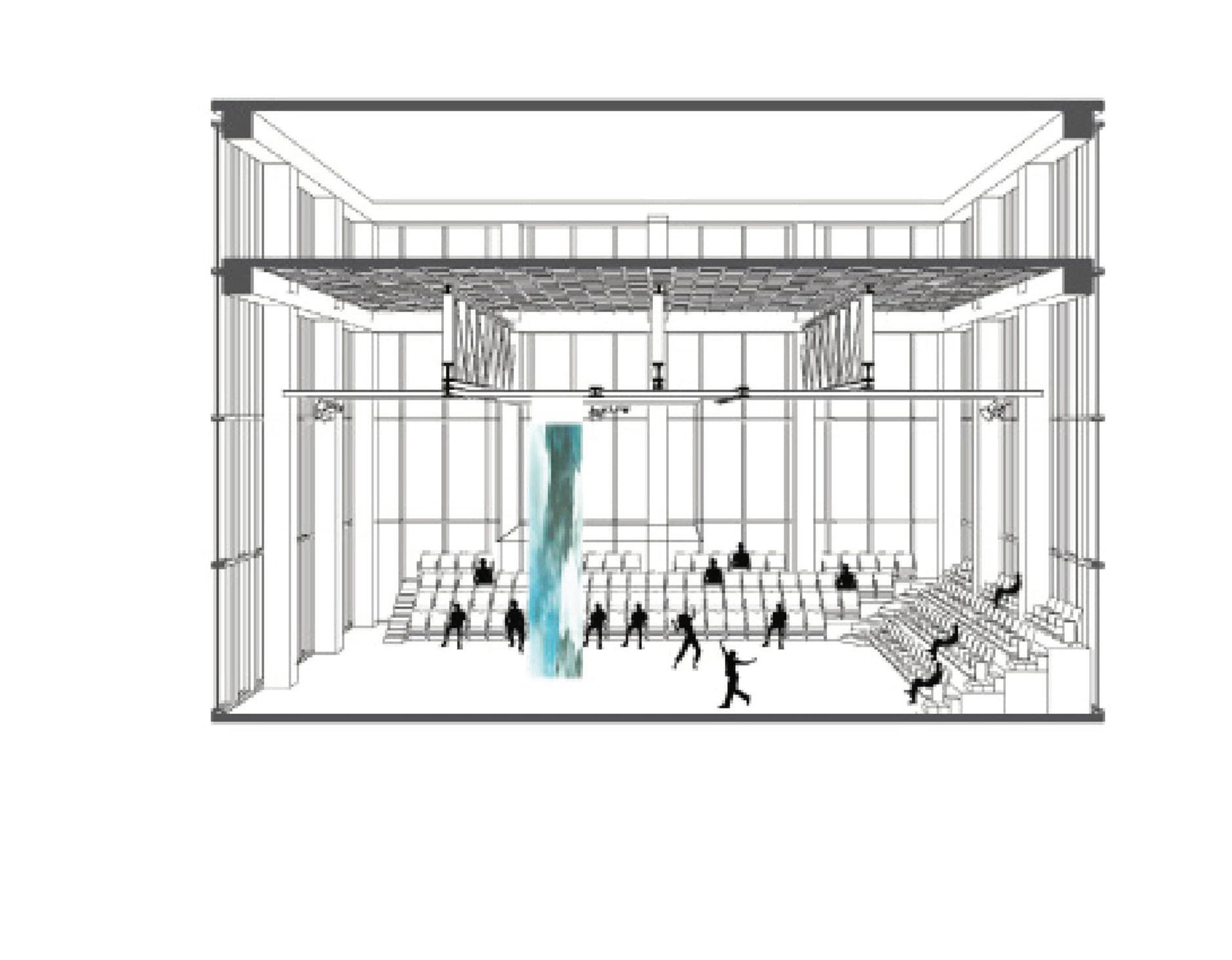 Ainsi, j’ai imaginé un lieu-dispositif, semblable à une machine dont les rouages seraient les différents éléments qui composent le lieu. Les gradins seraient télescopiques, pouvant donc occuper la salle selon le besoin, et seraient abrités par un système d’échafaudages. Ce système nous permet de ceinturer la salle et d’en délimiter les contours avec un élément de langage urbain qui conserve une grande part de modularité. Les échafaudages seraient libres d’accès pour le public qui peut ainsi flâner dans la salle et trouver le point de vue qui l’intéresse, mais accueille aussi de petites salles pour le personnel du lieu.