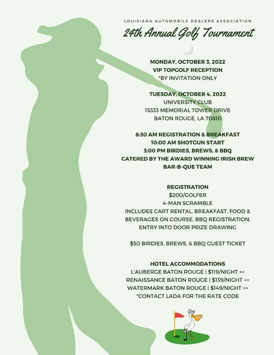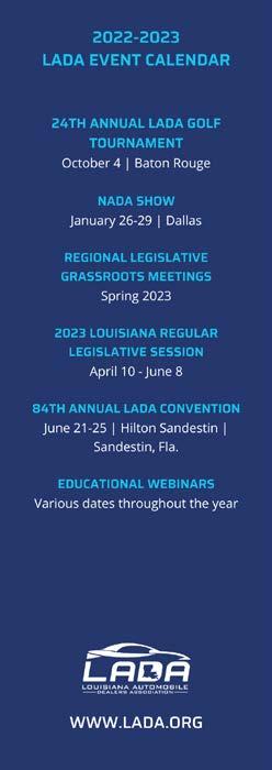 We will continuously monitor the legislative sessions, both federal and state, to ensure that our interests are protected and strengthened. If there is anything I or LADA can do for you, I personally encourage you to reach out to myself, marshall@ harperminden.com, or Will Green, wgreen@lada. org. We are here to serve YOU, the dealer body. Thank you for allowing me to serve, and I look forward to another successful campaign of LADA.