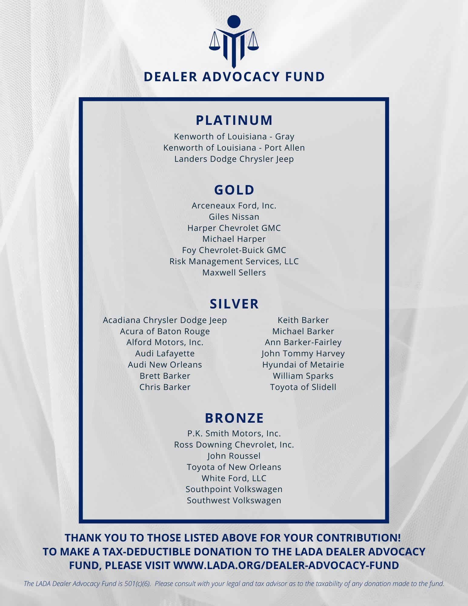 In order to better serve our dealer members and help promote and protect our franchise system, your Board of Directors has created the Dealer Advocacy Fund. We face bigger and evolving challenges with every passing year, and this fund sets out to support the laws, regulations and statutes defending Louisiana dealers and in turn protects our employers, customers, and the communities that we serve.